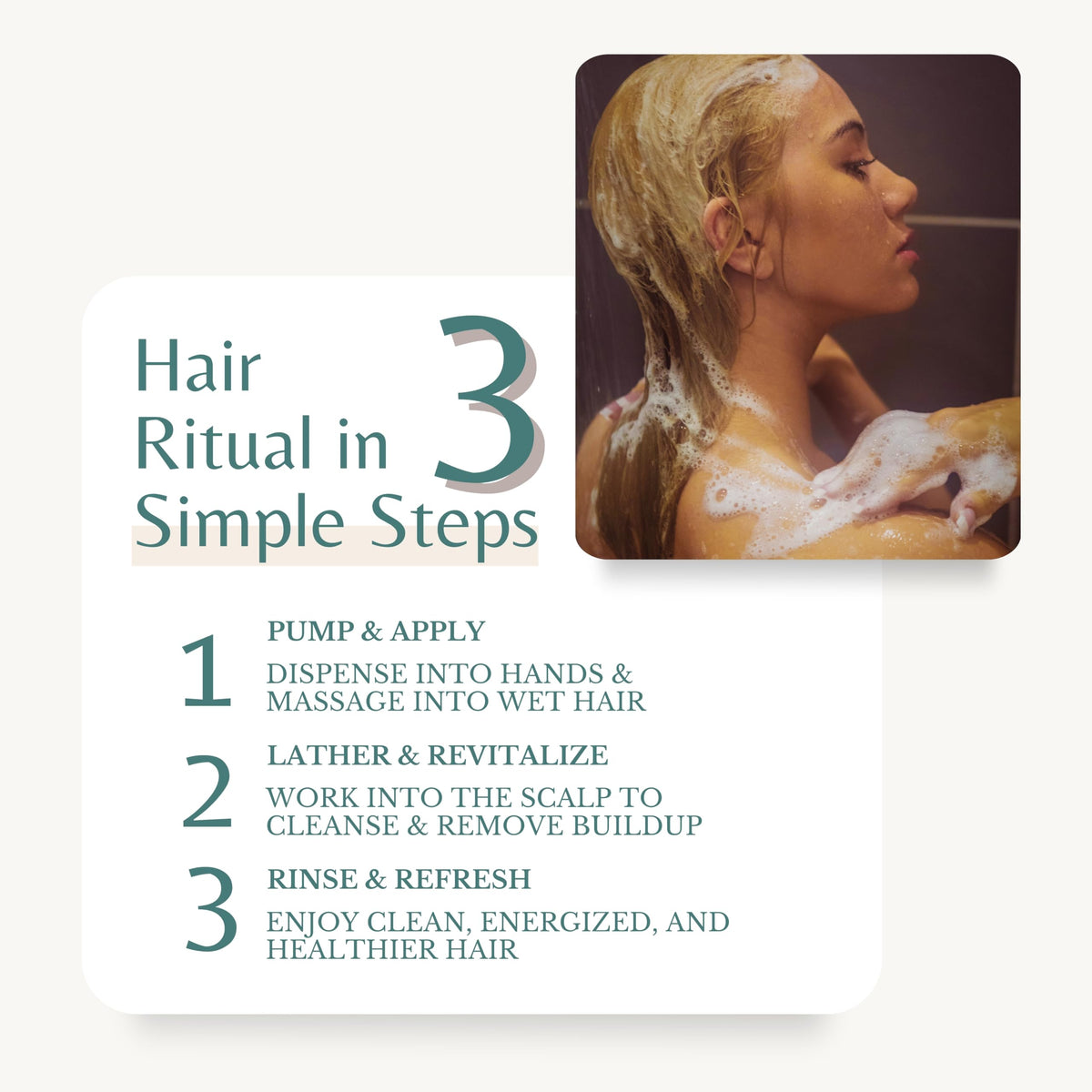 Wet hair, apply shampoo, massage into a lather, rinse thoroughly.
