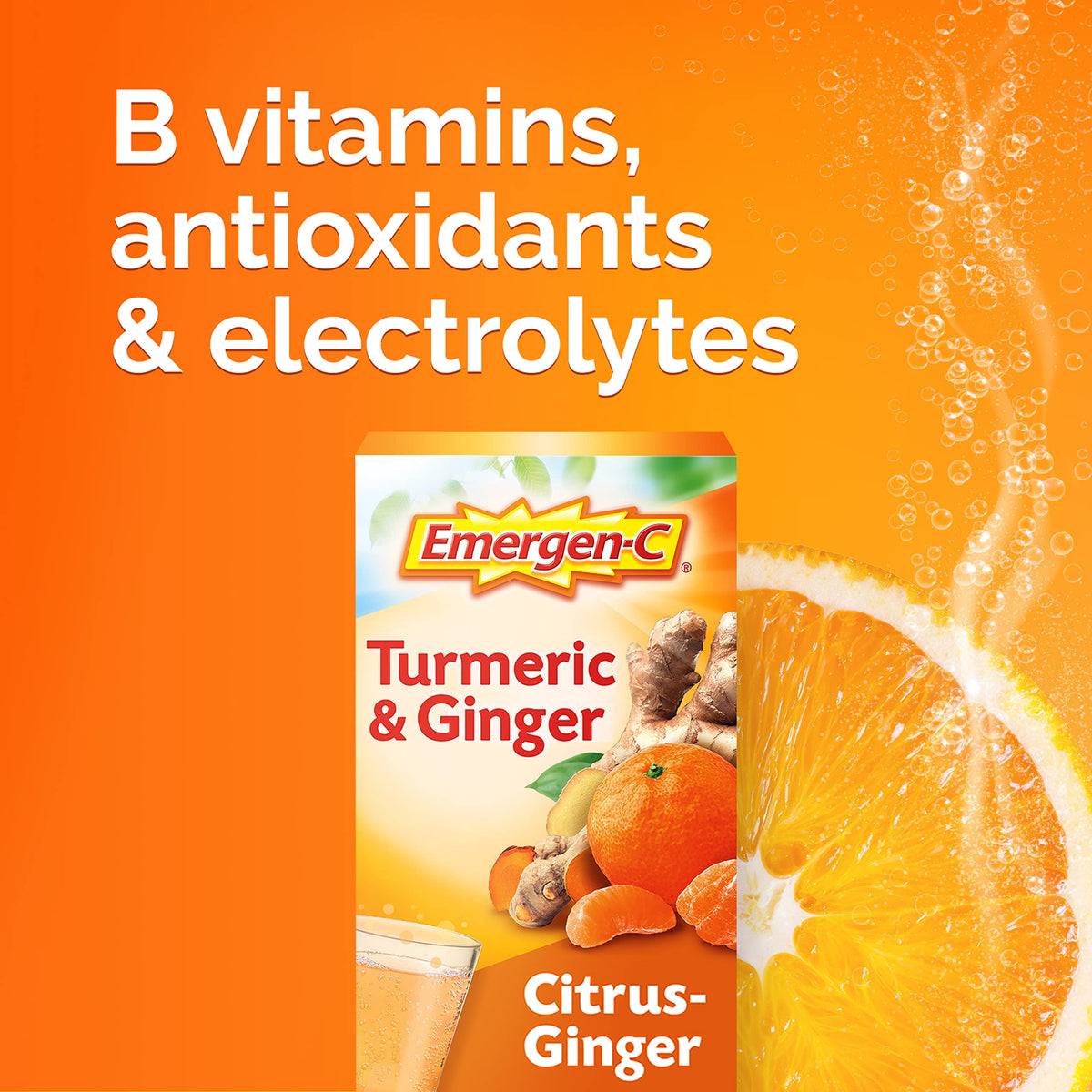 Emergen-C Citrus-Ginger Fizzy Drink Mix offers a refreshing blend of Turmeric and Ginger for Immune Support. Each pack contains 18 servings of Natural Flavors with High Potency Vitamin C to boost your daily wellness routine.