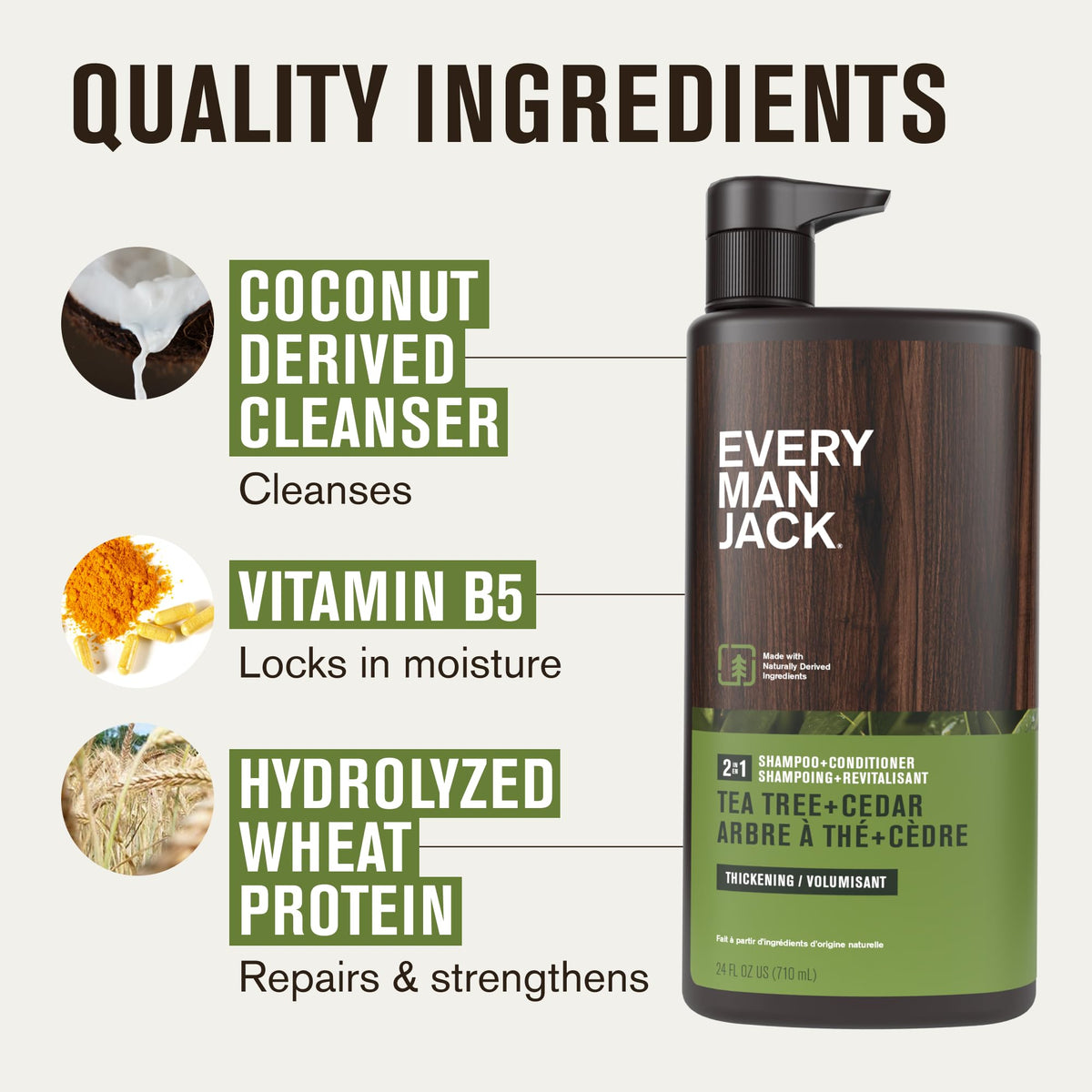 Every Man Jack 2-in-1 Tea Tree + Cedar Shampoo + Conditioner - Thicken, Cleanse, and Hydrate Hair with Coconut, Aloe, Tea Tree Oil - Naturally Derived and No Harmful Chemicals - 24oz -1 Bottle