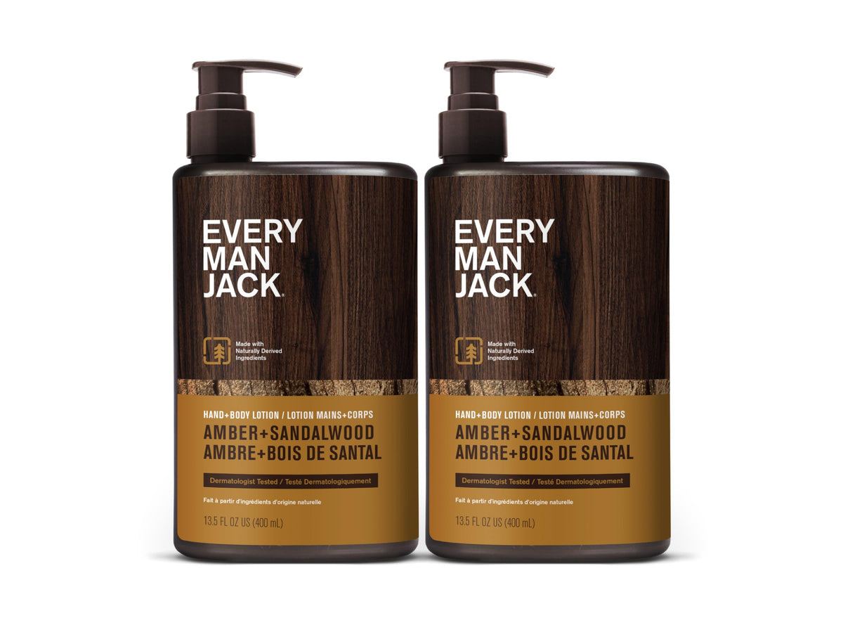 Every Man Jack Mens Amber + Sandalwood Hand & Body Lotion for All Skin Types - Dermatologist Tested & Hypoallergenic - Nourish Skin with Lightweight Fast Absorbing Lotion - 13.5oz 2 Bottles