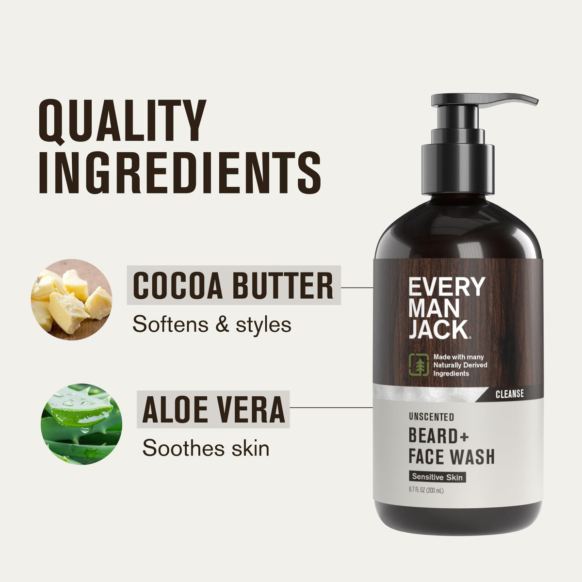 Every Man Jack Unscented Beard + Face Wash - Fragrance Free for Sensitive Skin - Naturally Cleanse and Condition Your Beard and Skin - 6.7-ounce (2 pack)