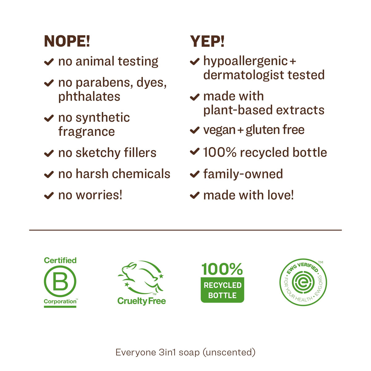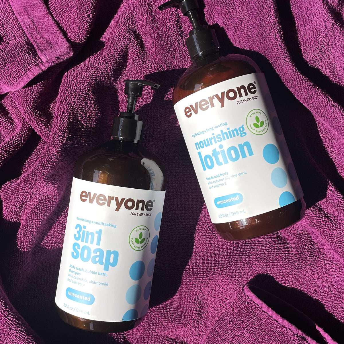 Everyone 3-in-1 Soap, Body Wash, Bubble Bath, Shampoo, 32 Ounce (Pack of 2), Unscented, Coconut Cleanser with Plant Extracts and Pure Essential Oils