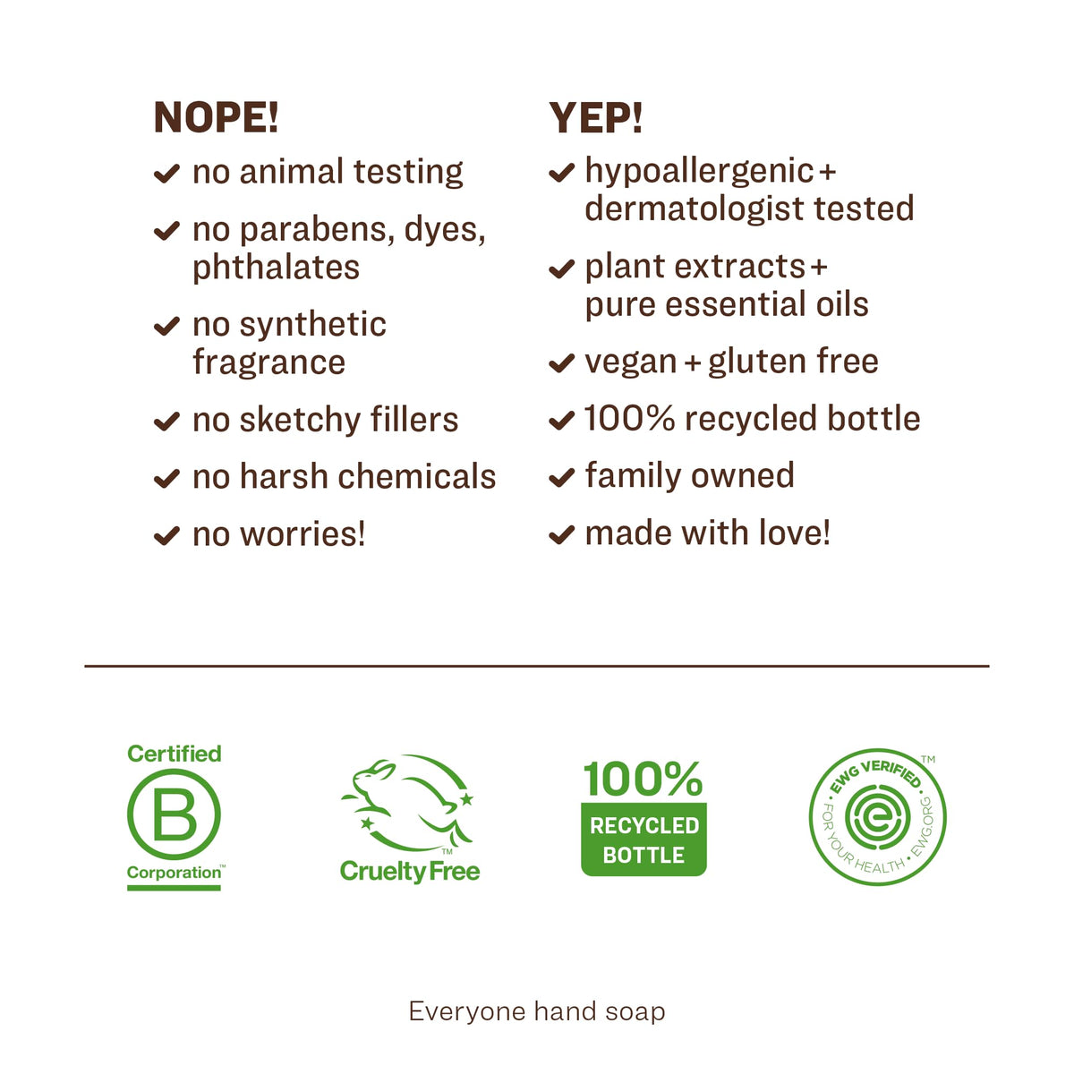 Short Product Description :: We believe what we put on our bodies is as important as what we put in our bodies. This is why we created Everyone Liquid Hand Soap, a gentle and effective EWG verified soap made from our signature blend of organic botanical extracts. Combining soothing organic herbs like calendula, aloe vera, and chamomile with the antioxidants of white tea extracts and vitamins E and B5, you end up with hands that feel nourished, refreshed, and sparkling clean. Just what nature intended. Gentle enough for everyone, and everyday use, our coconut-derived hand soap effectively washes hands, leaving them clean and touchably soft with the subtle scent of pure essential oils. At EO Products, we believe the best resources come from nature. That is why we are committed to our zero-waste mission. Our products are always made with reduction and repurposing in mind, this includes our recyclable packaging. Since 1995, we've made our products from domestic and imported ingredients in our family-owned and -operated factory in San Rafael, California. We learned early on that the only way to meet our own high standards was to take responsibility for everything ourselves. From our family to yours, enjoy.