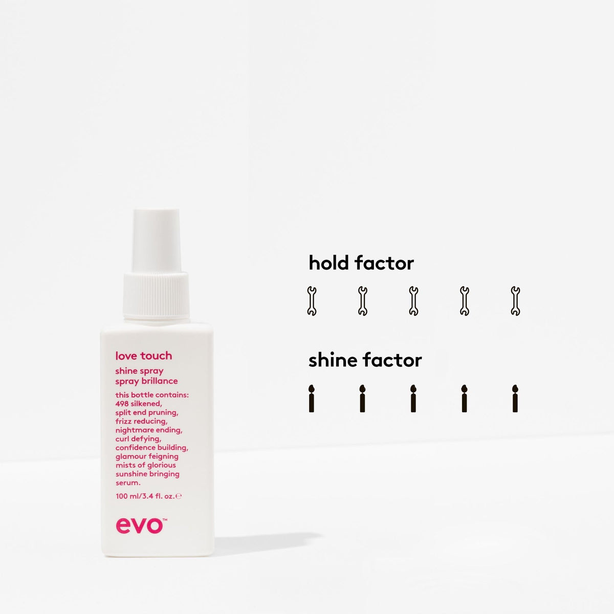 Get a touch of shine with Evo Love Touch Shine Spray. This spray enhances your hair's natural shine, leaving it looking glossy and healthy.