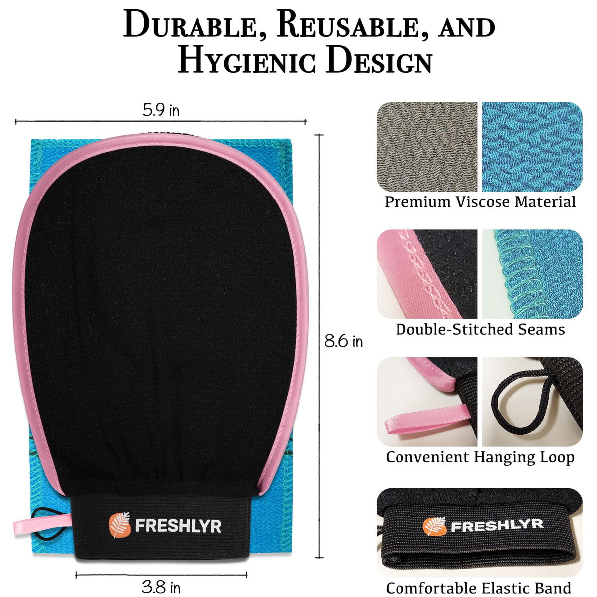 Safety Warning :: Choose the right glove texture for your skin type, starting with the gentlest option and adjusting as needed. Avoid scrubbing too hard to prevent skin irritation; adjust the pressure based on your skin’s sensitivity. Do not use on sensitive, irritated, or damaged skin, or on areas affected by conditions like eczema or dermatitis.