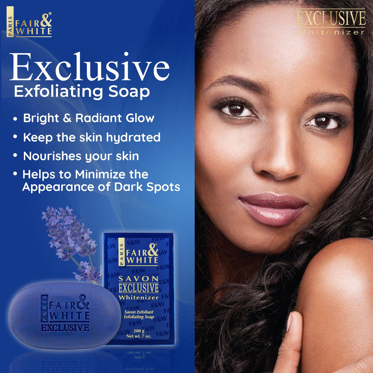 Pamper your skin with FAIR & WHITE Exclusive Exfoliating Soap. This 200g / 7oz bar soap gently exfoliates, leaving your face and body moisturized and refreshed.
