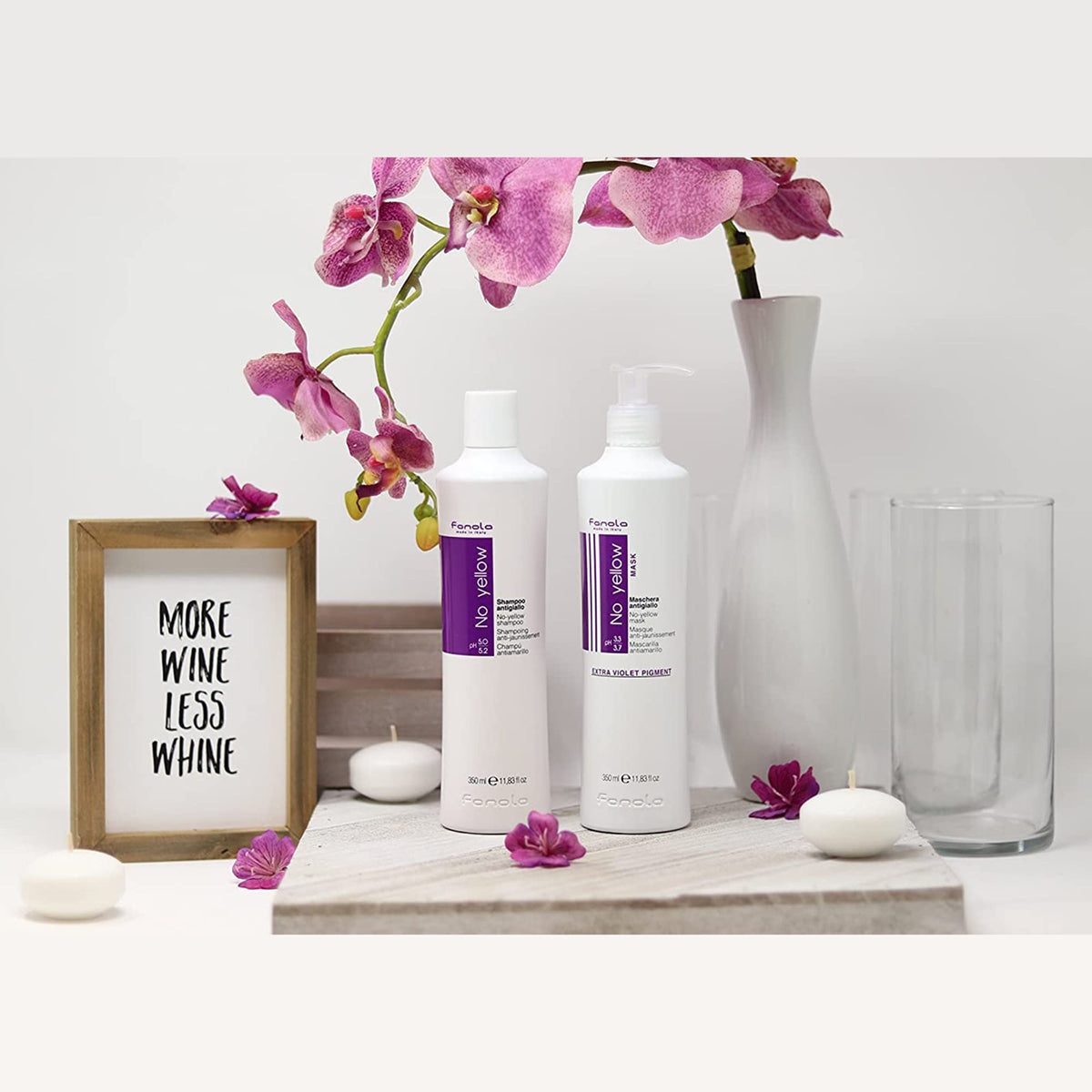 - How to Use No Yellow Care - Apply Fanola Anti-Yellow Shampoo to wet hair and massage. Leave on for 1 to 5 minutes, lather and rinse thoroughly. After rinsing off your Anti-Yellow Shampoo, wear single-use gloves and apply Fanola No Yellow Mask onto towel-dried hair from lengths to ends. Leave on for 3-5 minutes and rinse thoroughly. For best results, use at least once a week or until desired blonde level is reached.
