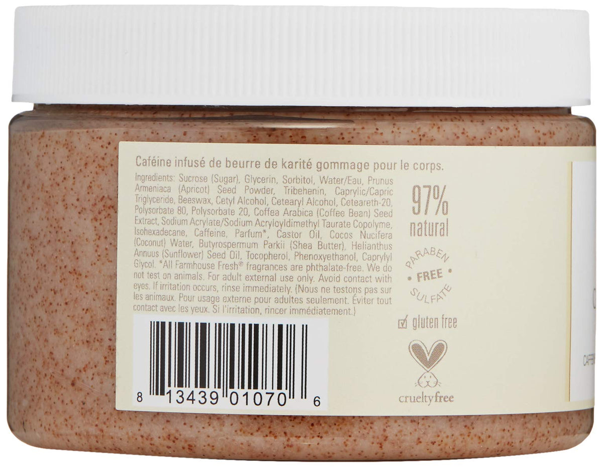 Ingredients :: Sucrose (Sugar), Glycerin, Sorbitol, Water/Eau, Prunus Armeniaca (Apricot) Seed Powder, Tribehenin, Caprylic/Capric Triglyceride, Beeswax, Cetyl Alcohol, Cetearyl Alcohol, Ceteareth-20, Polysorbate 80, Polysorbate 20, Coffea Arabica (Coffee Bean) Seed Extract, Sodium Acrylate/Sodium Acryloyldimethyl Taurate Copolyme, Isohexadecane, Caffeine, Parfum*, Castor Oil, Cocos Nucifera (Coconut) Water, Butyrospermum Parkii (Shea Butter), Helianthus Annuus (Sunflower) Seed Oil, Tocopherol, Phenoxyethanol, Caprylyl Glycol. *All FarmHouse Fresh fragrances are phthalate-free.