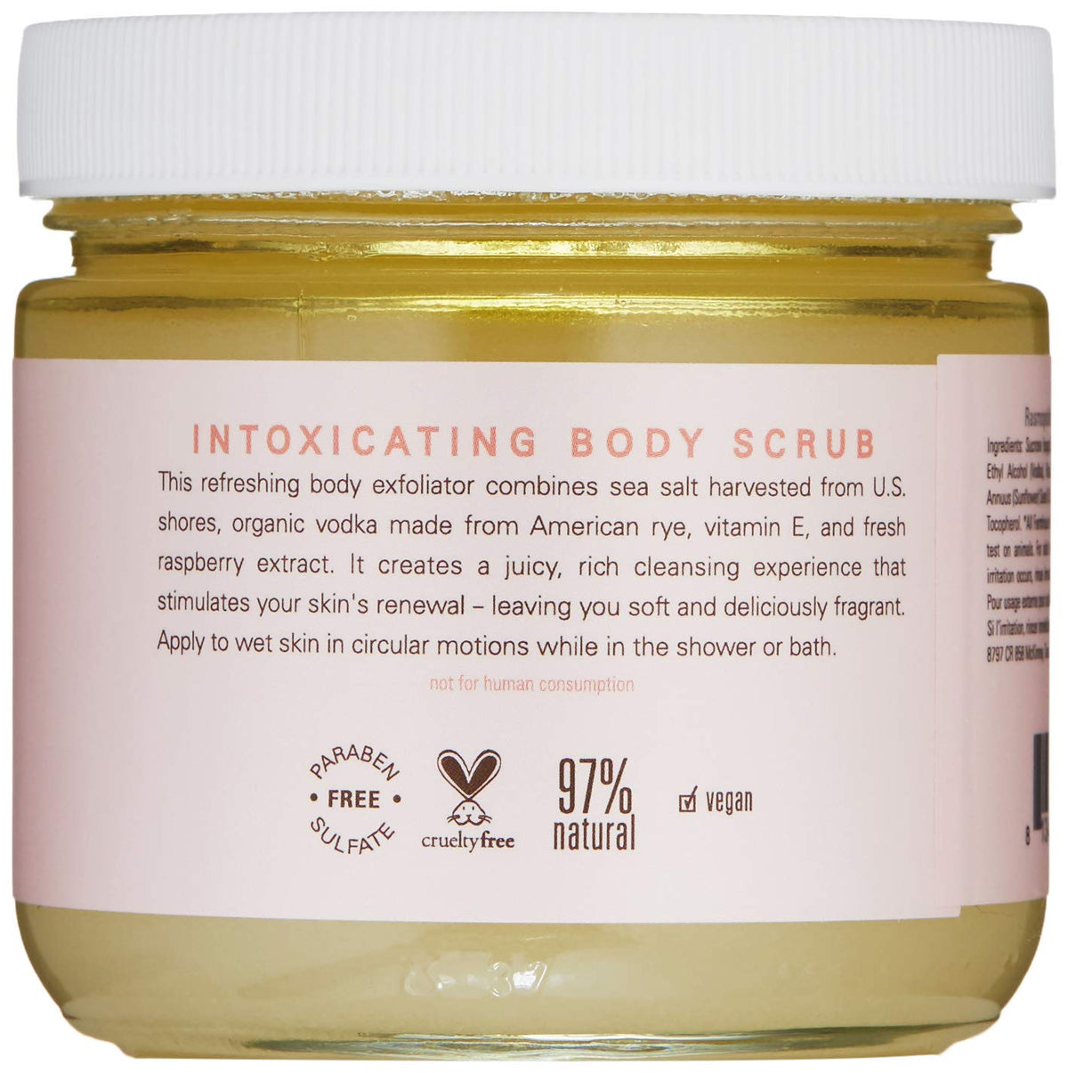 Short Product Description :: Liquor infused body polish made of organic vodka, raspberry extract, sugar and rice bran oil.