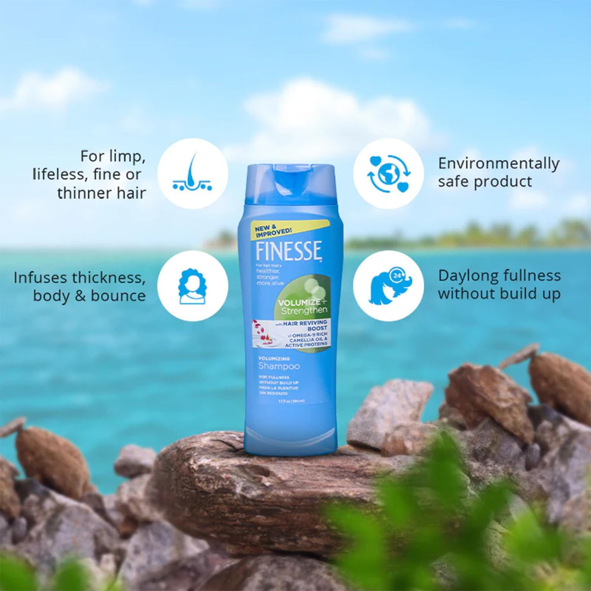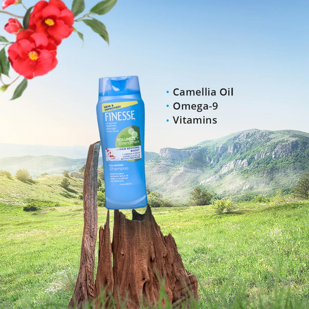 FINESSE Volumize + Strengthen Volumizing Shampoo is a 13 oz formula that adds volume and strength to your hair. Enjoy fuller and healthier-looking hair with this volumizing shampoo.