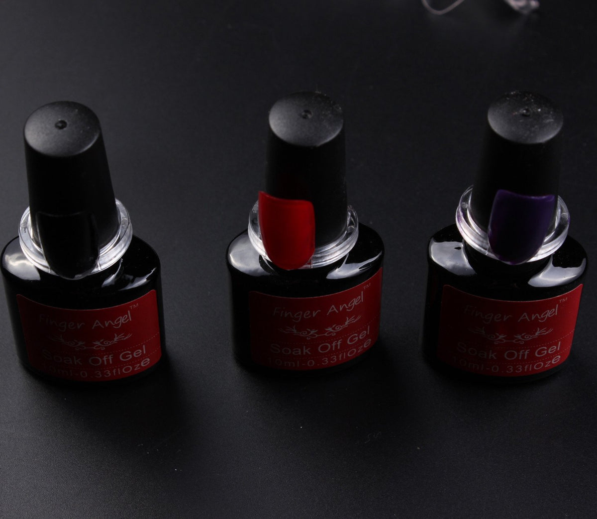 Finger Angel Clear Polish Nail Display is a set of 100 UV gel color pops for showcasing nail art designs. These ring-style nail tips are perfect for nail technicians and beauty enthusiasts to display their creativity.