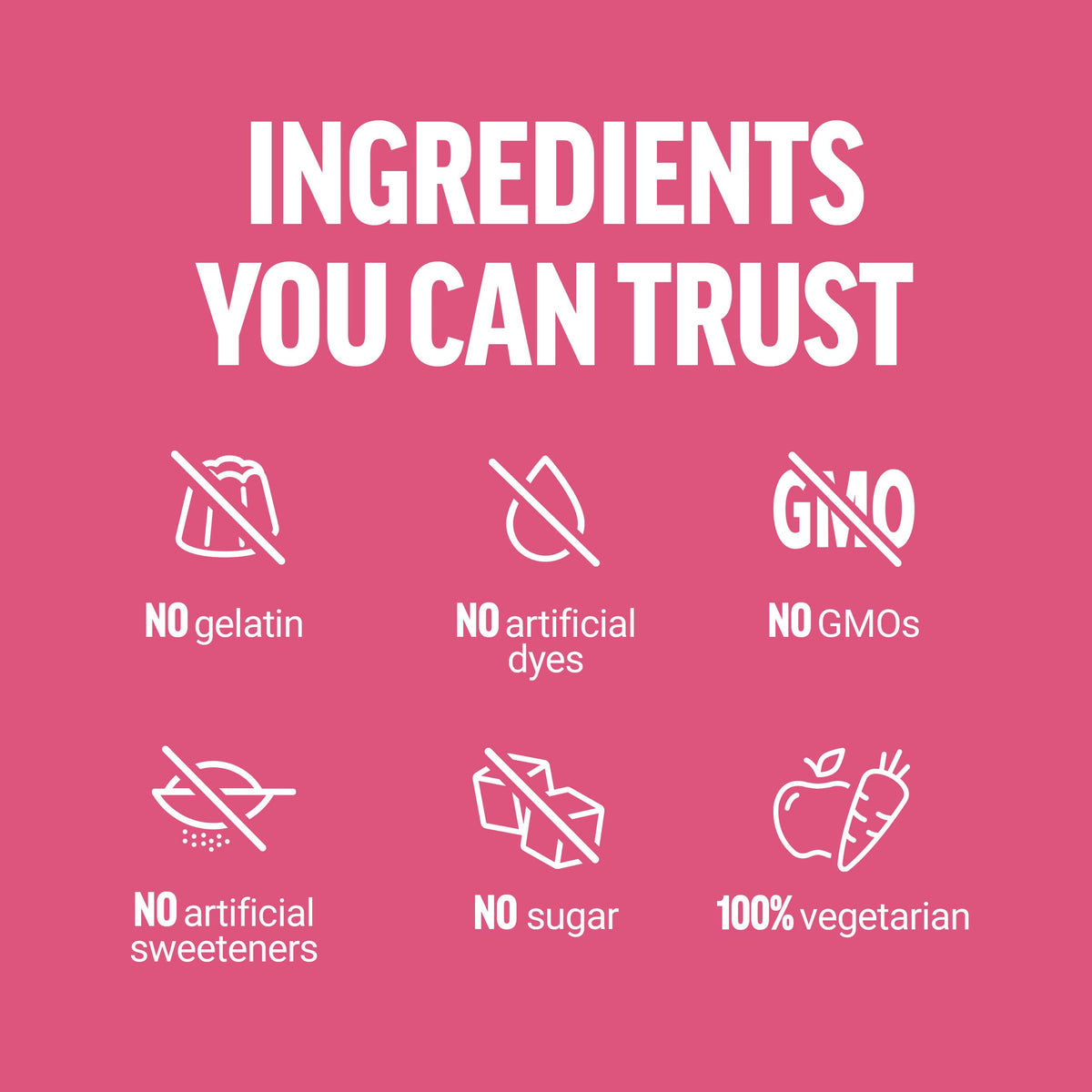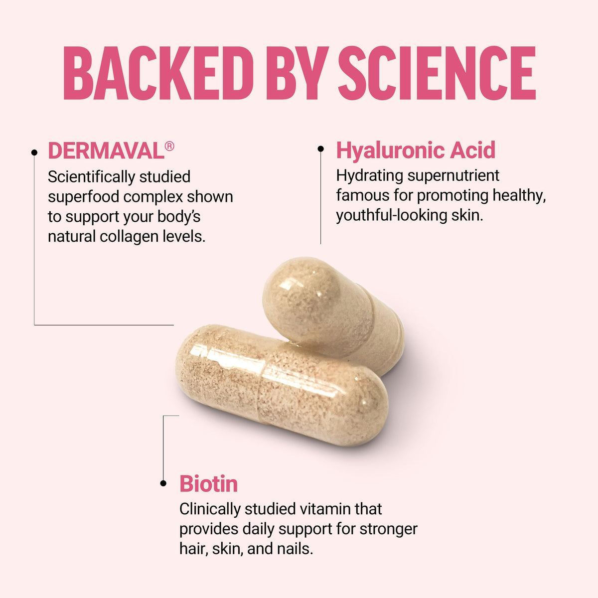 Ingredients :: Vitamin C (as Ascorbic Acid), Vitamin E (as d-Alpha Tocopheryl Succinate), Niacin (as Niacinamide), Biotin, Amino Acid Support Matrix, L-Glycine, L-Lysine HCl, L-Proline, Bamboo (Bambusa vulgaris) Extract (std. to silica) (stem & leaf), Hyaluronic Acid (as Sodium Hyaluronate), DERMAVAL Superfood Complex, Pomegranate (Punica granatum) Extract (fruit), Asparagus (Asparagus officinalis) Powder (shoot), Okra (Abelmoschus esculentus) Powder (pod), CoffeeBerry (Coffea arabica) Extract (fruit), Quercetin (from Sophora japonica L.) Powder (flower), Acerola (Malpighia glabra) Powder (fruit), Camu Camu (Myrciaria dubia) Powder (fruit), Maltodextrin, Açai (Euterpe oleracea Mart.) Powder (fruit), Mangosteen (Garcinia mangostana L.) Powder (fruit). Other Ingredients: Hypromellose, Microcrystalline Cellulose, Vegetable Magnesium Stearate, Silica.