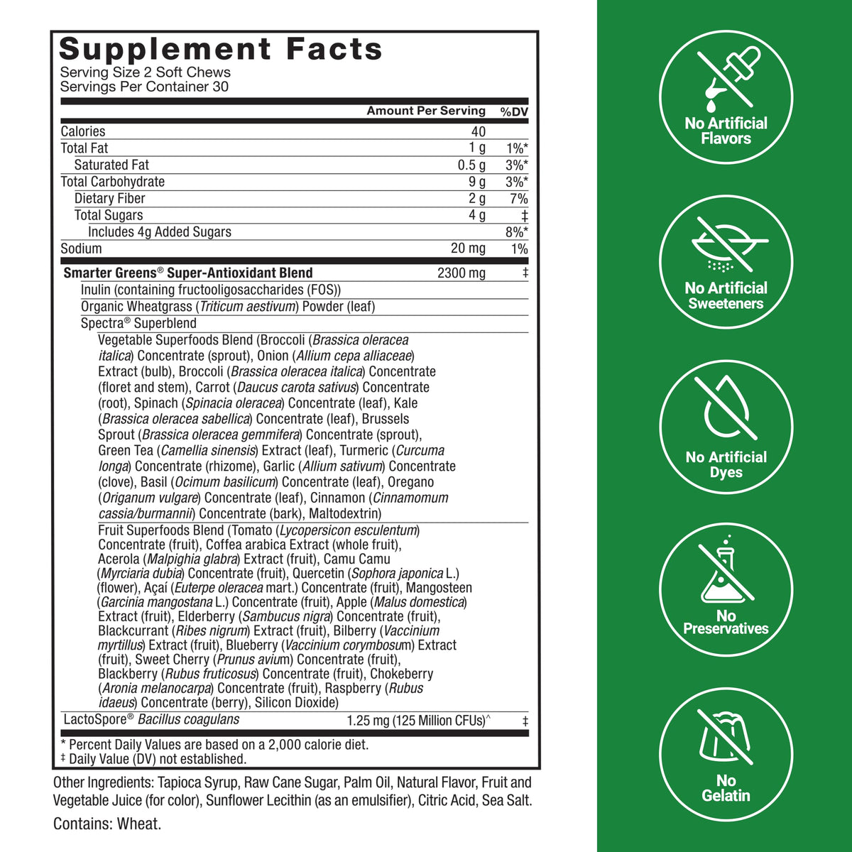 - ULTIMATE CONVENIENCE: Sometimes there’s just no time to mix up your favorite greens powder. Whether you’re at work, at school, or on the go, Smarter Greens Soft Chews are individually wrapped and easy to consume for the ultimate in convenience.