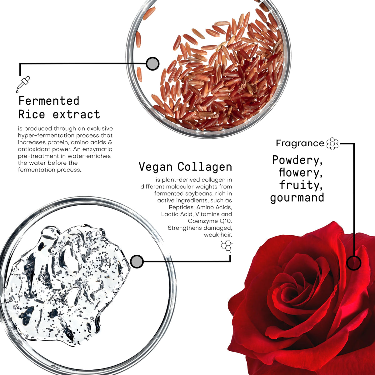 Short Product Description :: Enriched with Extract of Fermented Rice, Plant Peptides, Phyto Collagen, and Hyaluronic Acid, this 5-minute weightless hair mask restores the natural hair fiber structure. With 100% of plant origin polymer, this hair mask repairs the damaged parts, recompacting and sealing cuticles.