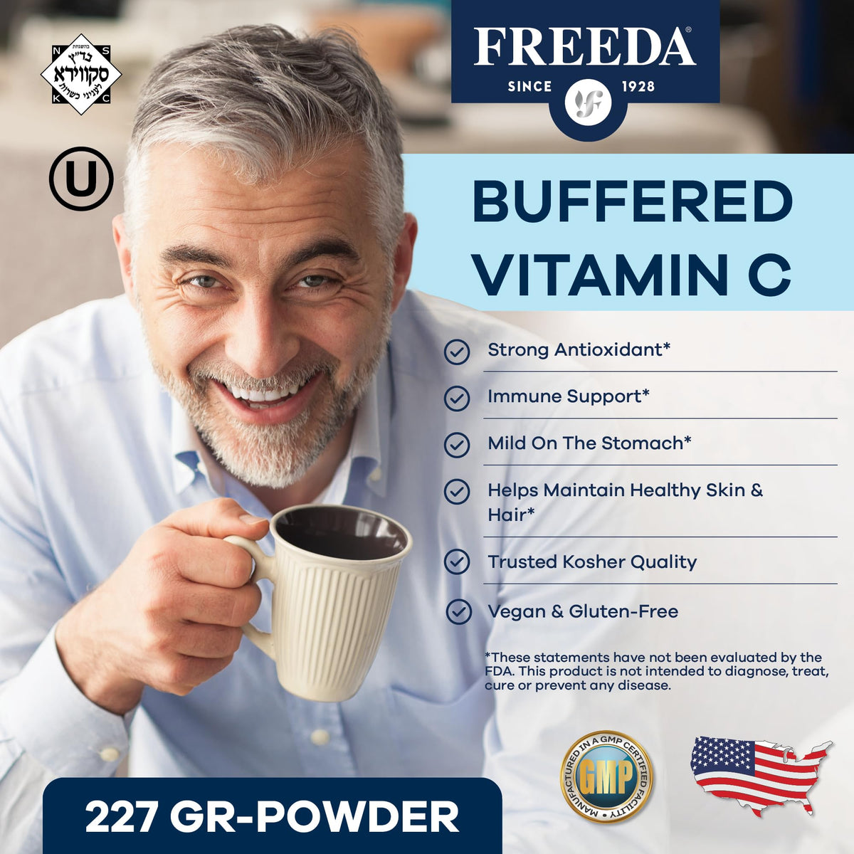 FREEDA Vitamin C - Buffered Vitamin C Powder - Kosher - Powerful Antioxidant Immune Support - Sensitive Stomach Vitamins C Drink - Calcium Ascorbate - Sugar Free Vitamin C - VIT C Supplement (16 oz)