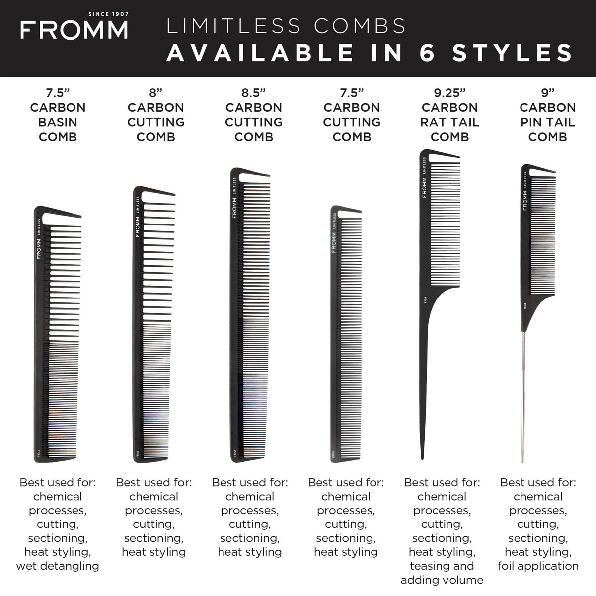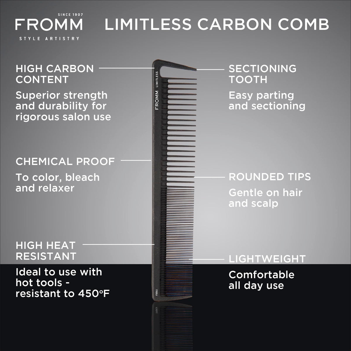 The Fromm Limitless 7.5" Carbon Basin Comb is a versatile tool designed for cutting, sectioning, styling, and detangling hair with ease. Its rounded tips and sectioning tooth ensure precise results, while being heat resistant up to 450°F.