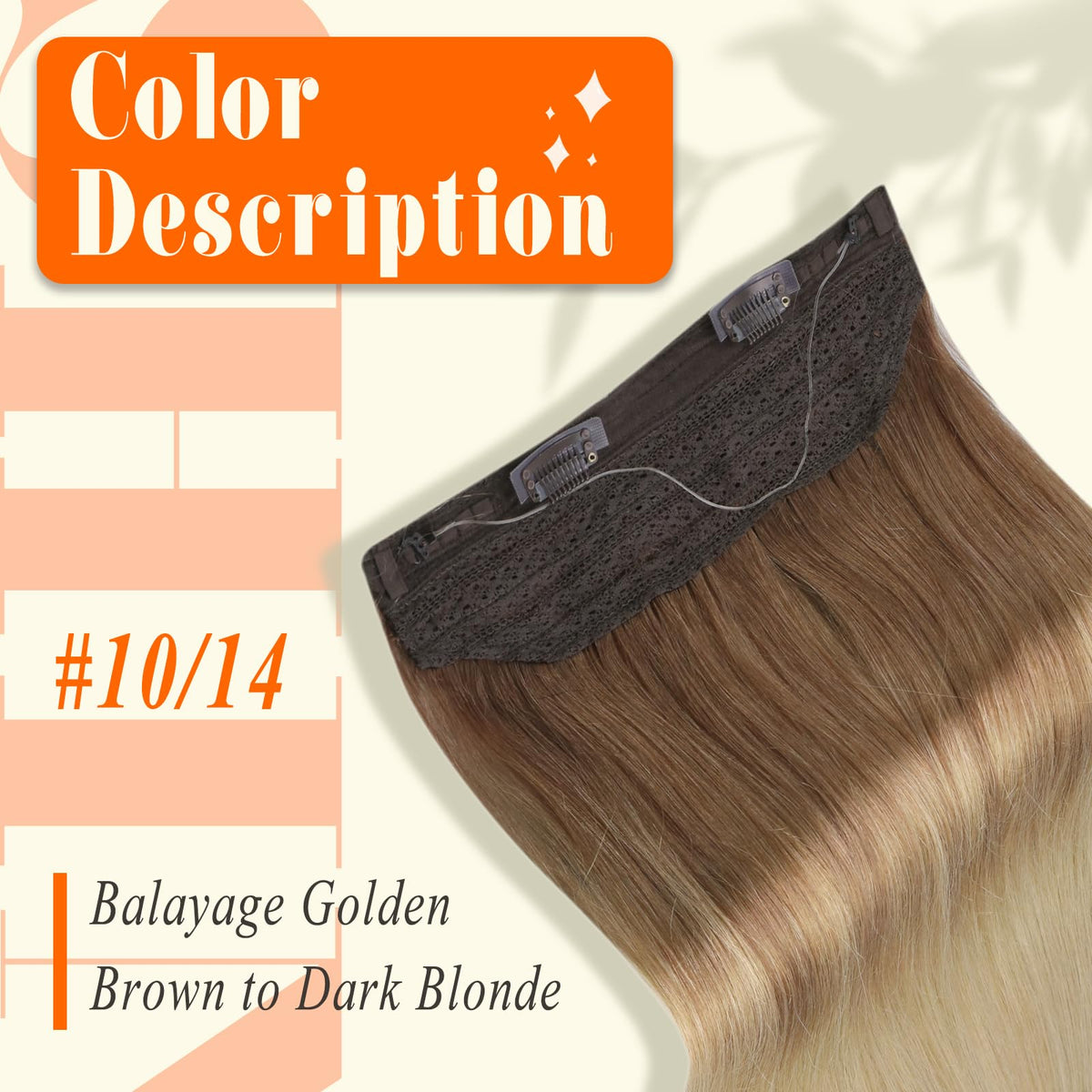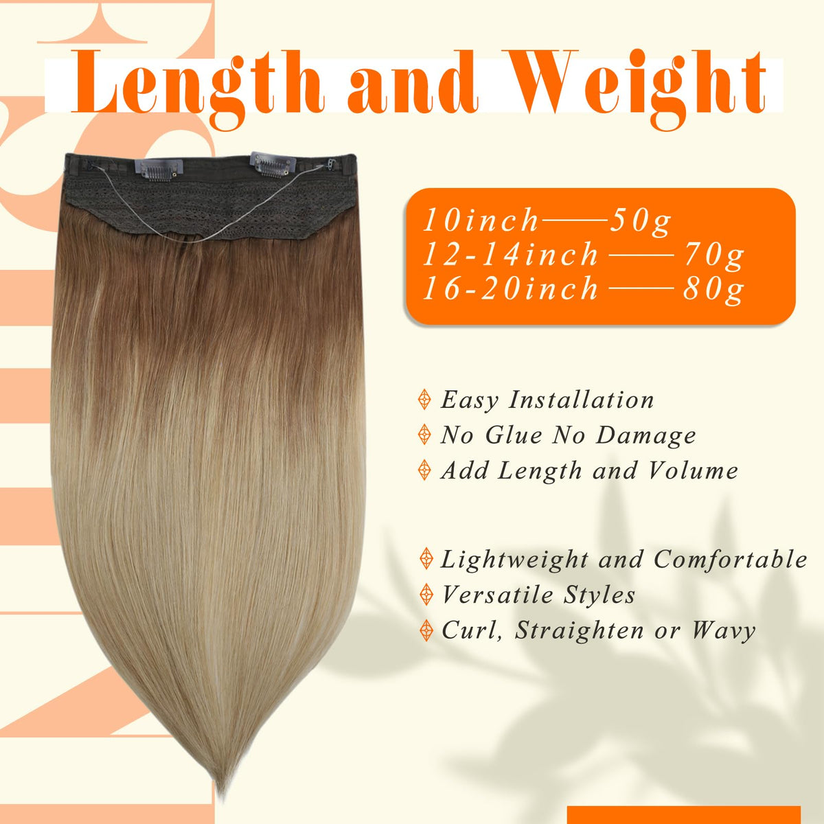The Fshine Invisible Wire Hair Extensions in Ombre Light Brown to Dirty Blonde provide a seamless solution for adding length and volume to your hair. This 16-inch real human hair clip-in extension offers a silky straight finish with a secret wire design for easy application.