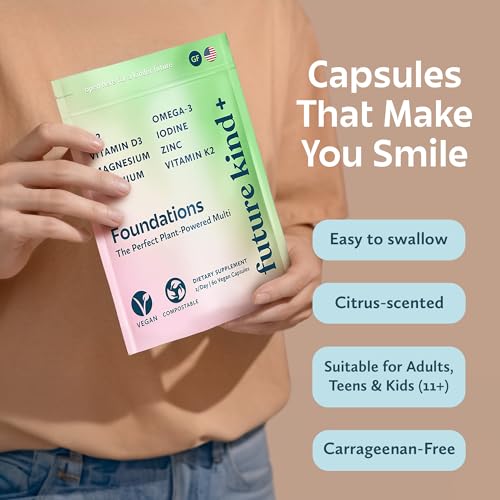 Ingredients: Future Kind CarrageenanFree Foundations Multivitamin Vegan Multivitamins for Women Men Plant Based Multivitamin, Omega3, B12, D3, Zinc, Iodine, Magnesium, K2 Selenium Compostable Bag