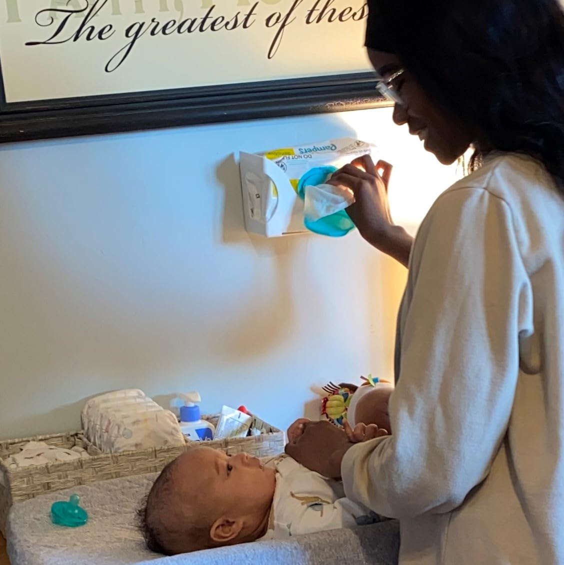 Product Benefit :: Wall Mounted Baby/Wet Wipe HOlder Keeps WIpes handy where and when you need them and keeps changing tables clutter free