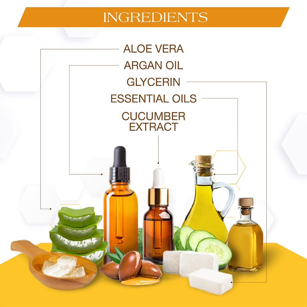 Ingredients: Aloe Vera, Argan Oil, Glycerin, Essential Oils, Cucumber Extract