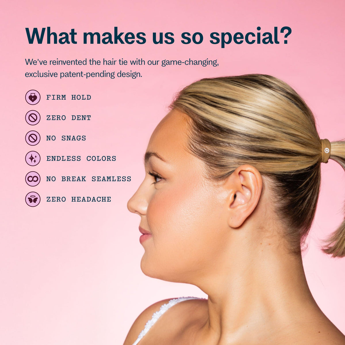 Gimme Beauty Fine Hair Elastic Bands are slim-fit ties designed for fine, brittle, or bleached hair. These gentle-grip ponytail holders offer a no-dent hold for all-day comfort.