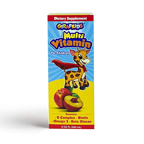 GirafKids Multivitamin Syrup for Children, 8oz | Daily Multivitamin for Kids Ages +4 with Omega-3, Beta Glucan & Folic Acid for Energy and Growth | Delicious Peach Flavor | Liquid Dietary Supplement