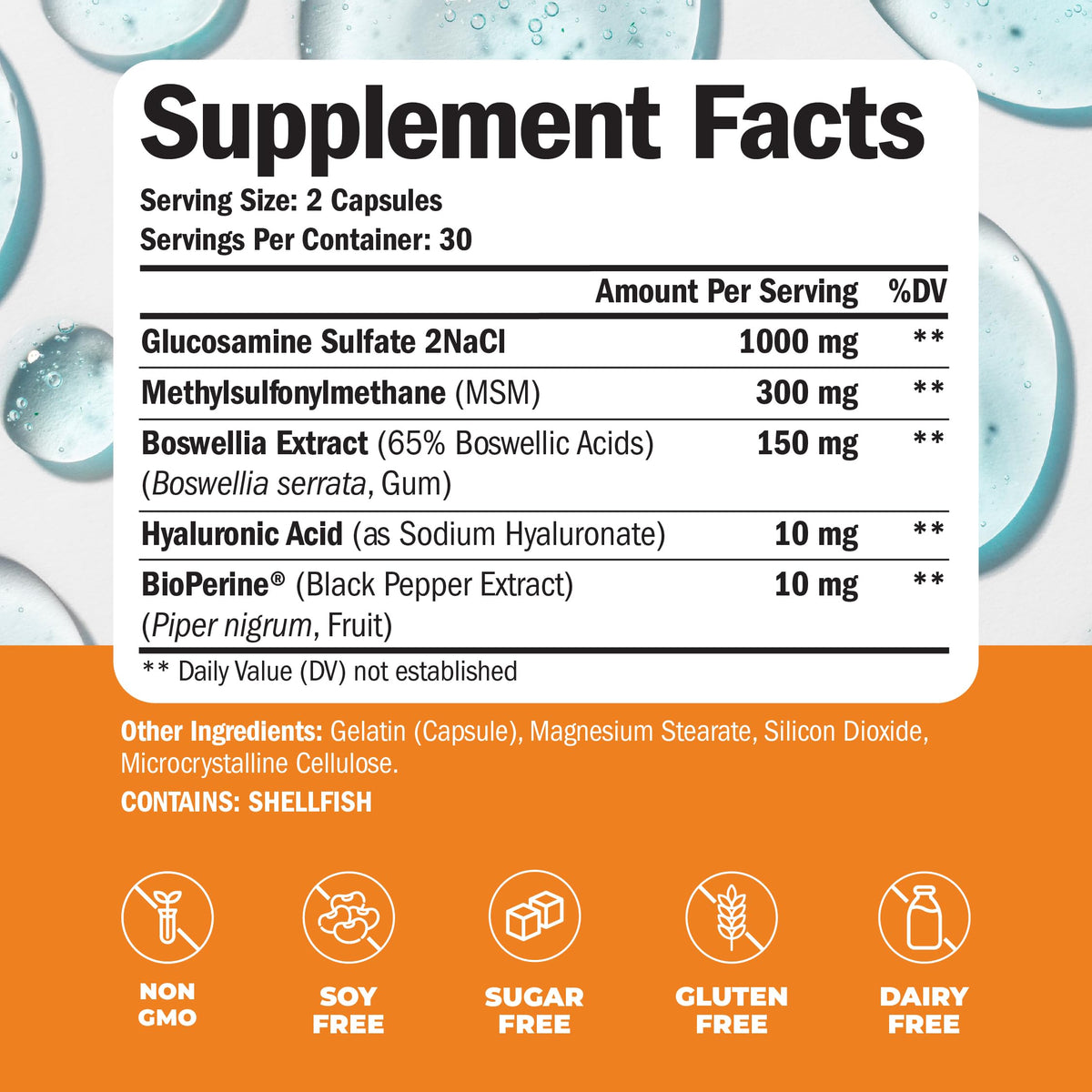 Ingredients :: Glucosamine Sulfate 2NaCI 1000 mg, Methylsulfonylmethane (MSM) 300 mg, Boswellia Extract (65% Boswellic Acid) (Boswellia serrata, Gum) 150 mg, Hyaluronic Acid 10 mg, BioPerine Black Pepper Extract (Piper nigrum, Fruit) 10 mg. Other Ingredients: Gelatin (Capsule), Silicon Dioxide, Microcrystalline Cellulose