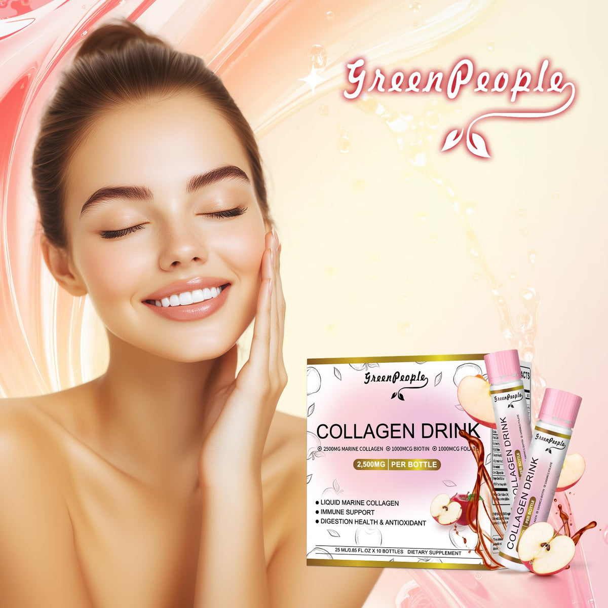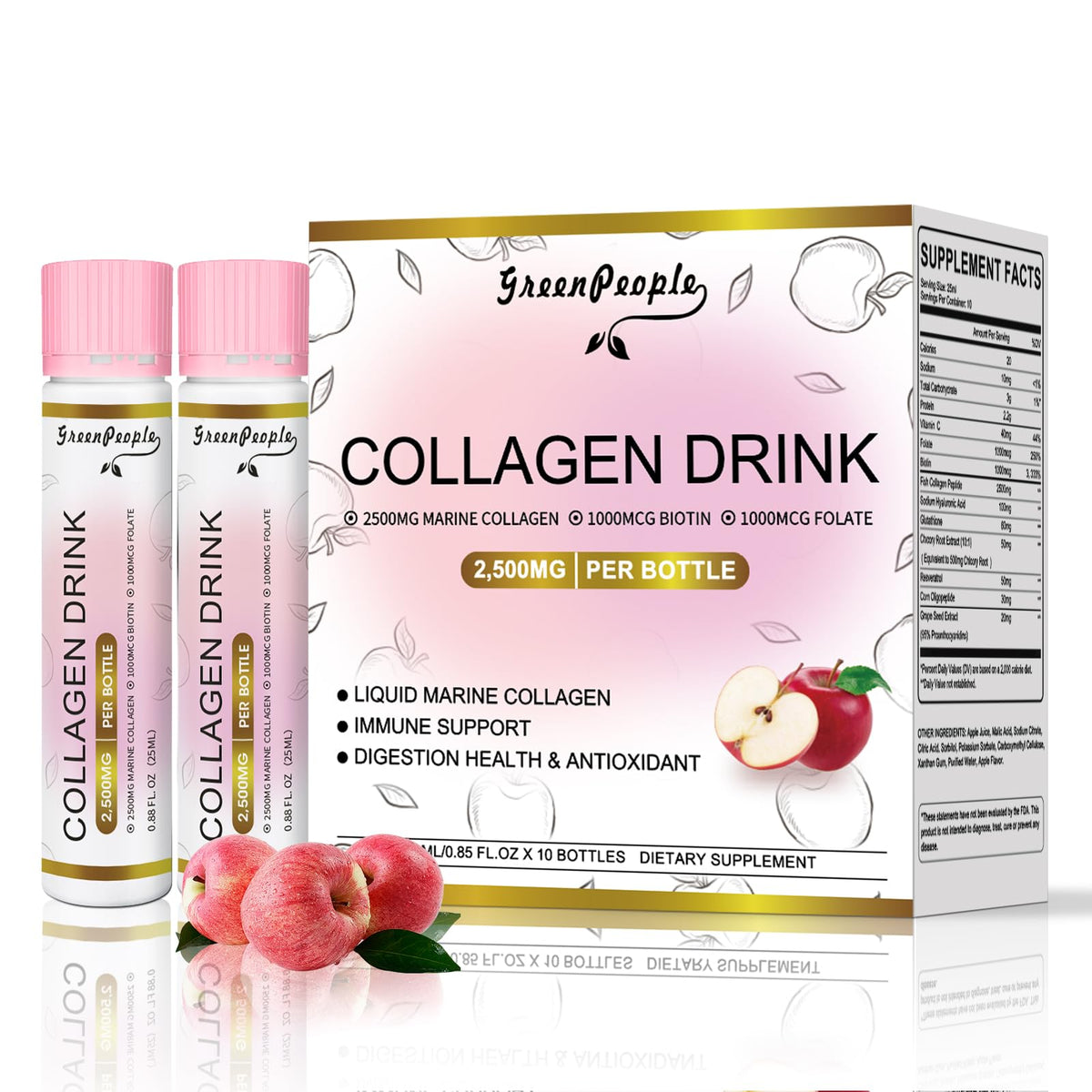 GREENPEOPLE Liquid Collagen for Women & Men, Fish Collagen Peptides + Hyaluronic Acid + Vitamin Bs & C, Hair Skin Nails Joints Bones Support (0.85 fl oz, 10 Bottles, Apple)