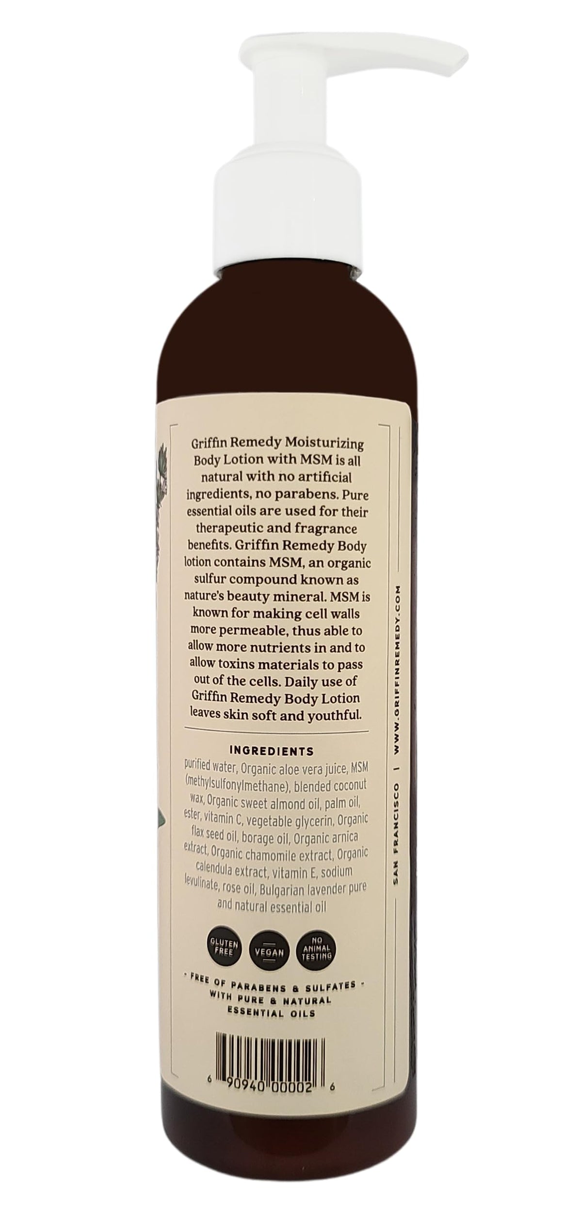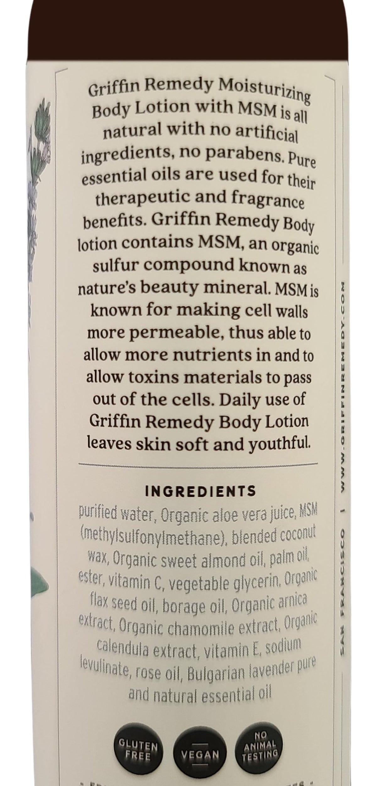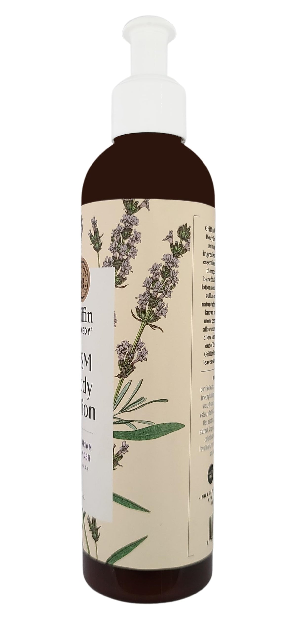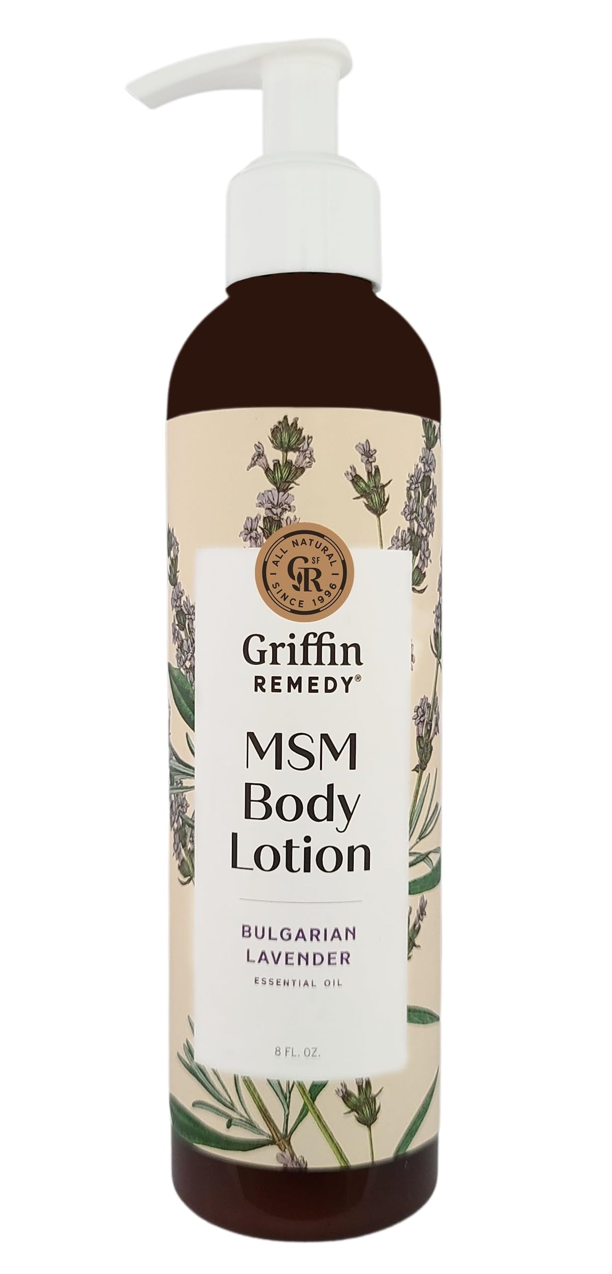 Griffin Remedy Bulgarian Lavender Body Lotion with MSM is a nourishing solution for dry skin. This 8oz bottle combines the calming properties of lavender with the moisturizing benefits of MSM for soft and supple skin.
