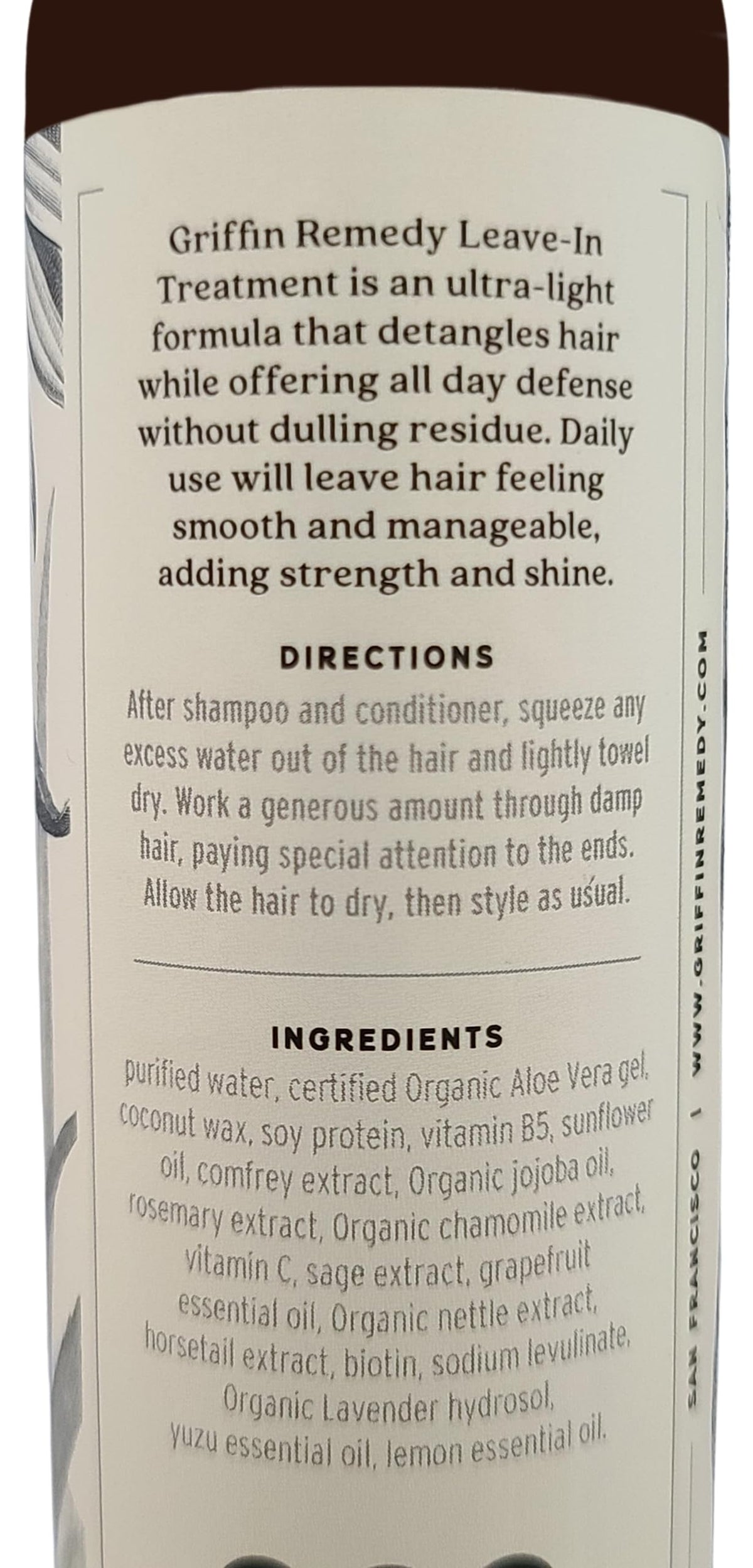 Apply GRIFFIN REMEDY Leave In Treatment through clean damp hair and comb through to distribute evenly. Do not rinse. Air dry, blow dry or style as usual. For best results, start with GRIFFIN REMEDY Restorative Shampoo.