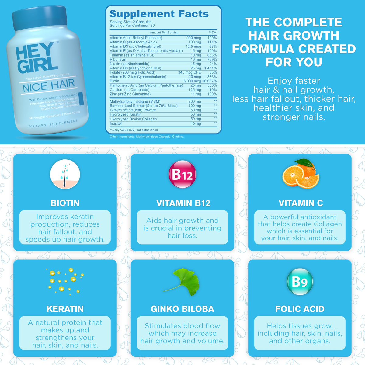 Hair Vitamins To Help Thinning and Fallout - Hair Supplement To Grow Hair Faster, Stronger & Have Healthy Skin & Nails - Scientifically Made With Biotin, Keratin, Folic Acid, Vitamin B, C, 60 Capsules