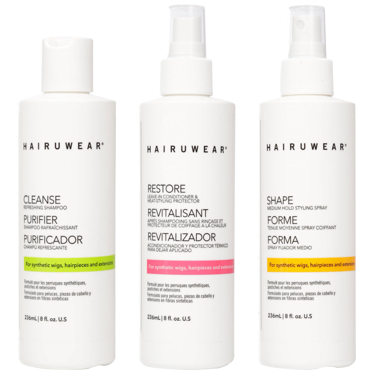 HairUWear Essential Hair Care set includes Cleansing Shampoo, Restoring Conditioner, and Styling Spray in 8 oz bottles. This comprehensive hair care system is designed to cleanse, nourish, and style your hair effectively.