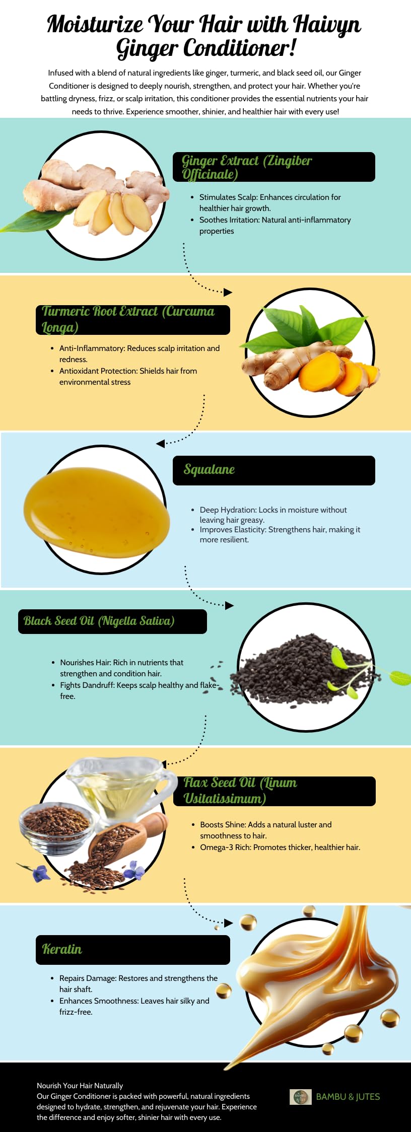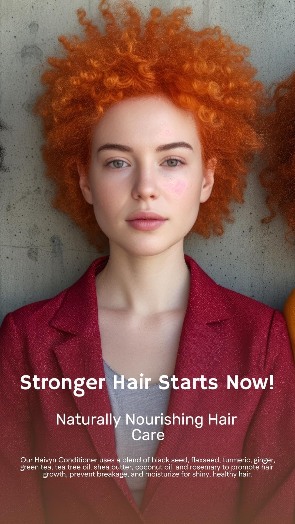 Haivyn Natural Ginger Conditioner is a luxurious blend of ginger, turmeric, black seed, and flaxseed oils that promote a healthy scalp and lustrous hair. This conditioner deeply nourishes and strengthens your hair, leaving it vibrant and silky.