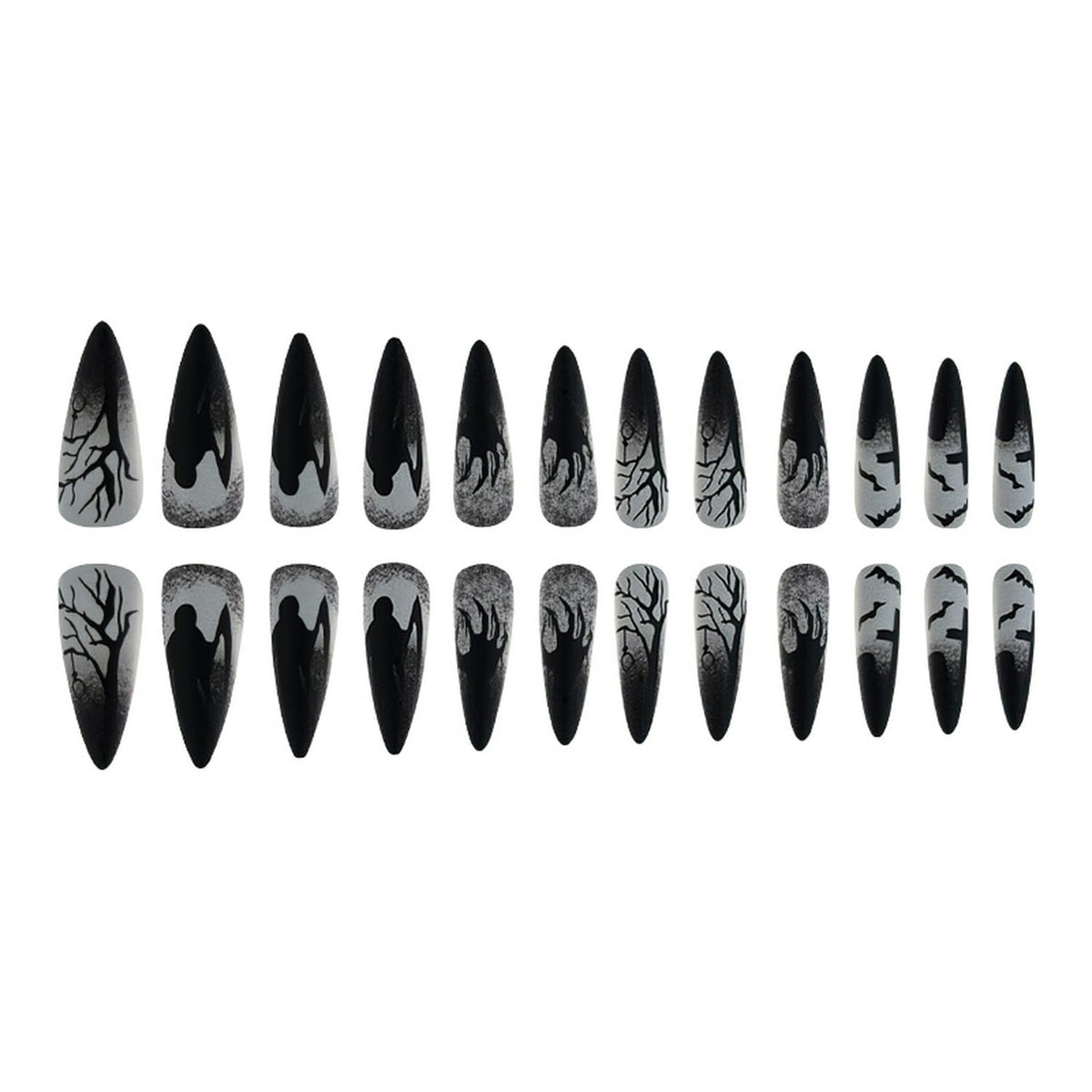 Get ready for Halloween with these Almond Fake Nails. Featuring bat and palm tree designs in black and grey, these full cover horror nails are perfect for a spooky manicure at Halloween parties.