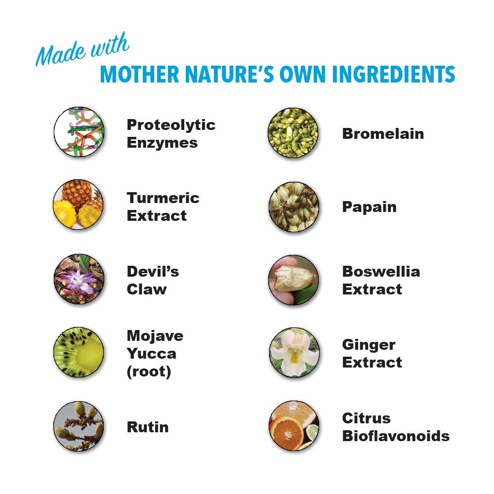 Ingredients: Systemic Enzyme Blend Protease AM Bromelain Protease 6.0 Alkaline Protease Papain Boswelllia serrata extract Citrus bioflavonoids complex Ginger root extract Yucca root Turmeric rhizome AlphaLipoic acid Rutin Devils claw root extract