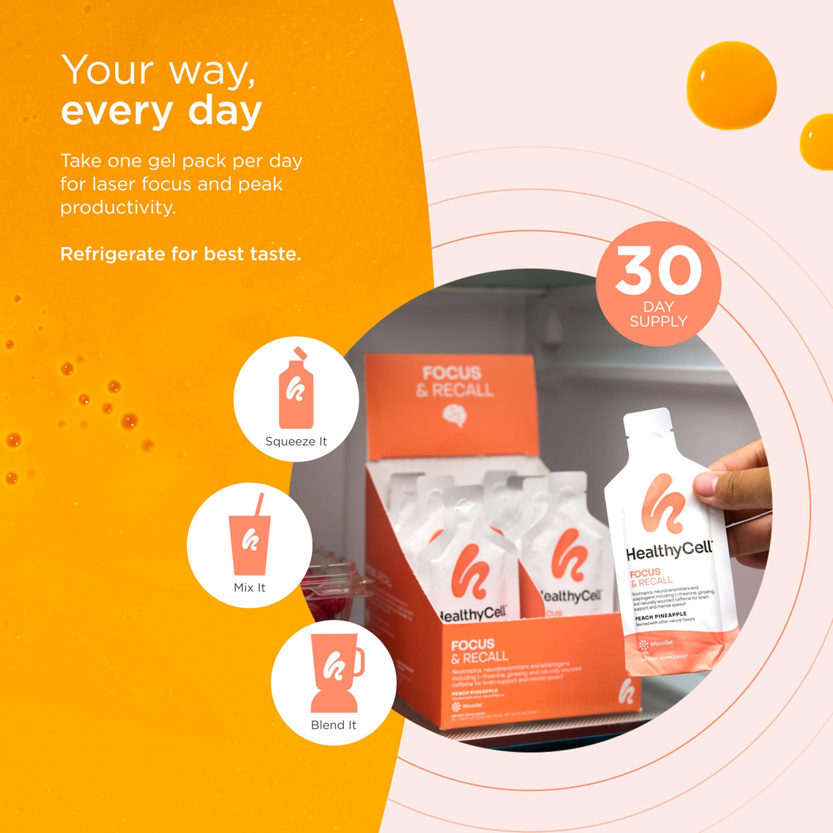 Enhance your focus and memory with Healthycell Focus & Recall, a daily liquid brain supplement designed for concentration and alertness. Each pack contains L-Theanine, Omega-3, and Taurine for optimal cognitive support.