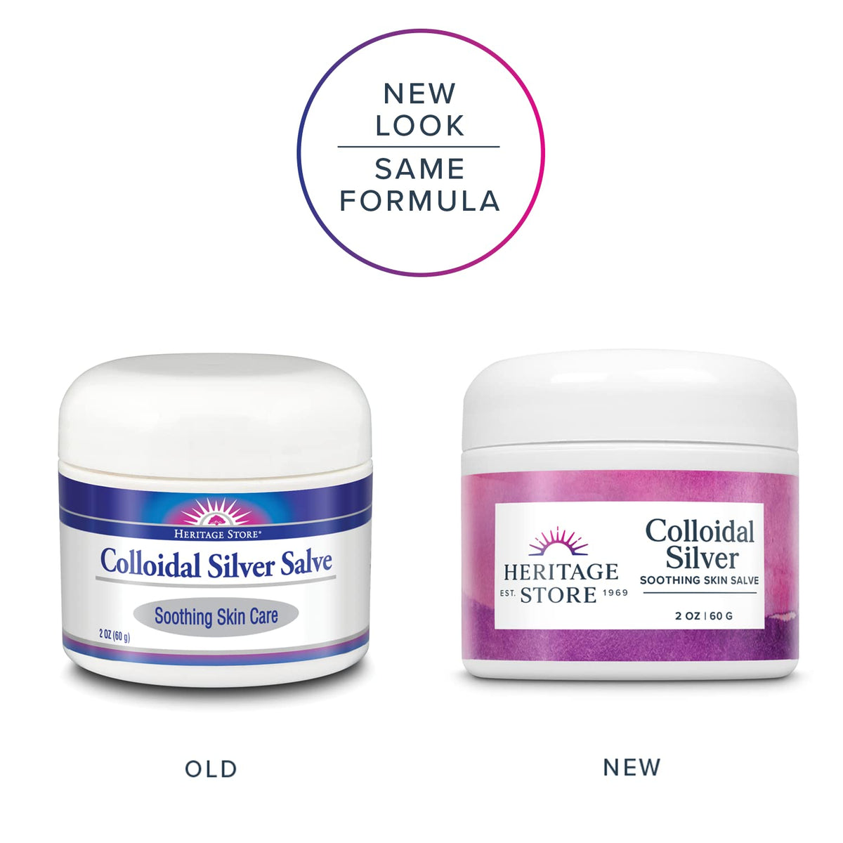 HERITAGE STORE Colloidal Silver Soothing Skin Salve is a natural remedy that nourishes and calms dry, problem areas of the skin. Enriched with Aloe Vera, Lavender Water, and Honey, it provides gentle care for sensitive skin.