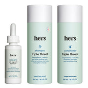 HIMS & HERS Triple Threat Shampoo, Conditioner and 2% Minoxidil Serum is a hair loss treatment set for women. It includes minoxidil serum, color-safe hair thickening shampoo, and conditioner in a 3-count pack.