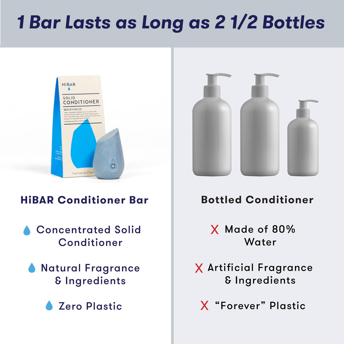 Transform your dry, frizzy hair with HiBAR Moisturize Conditioner Bar. This deeply nourishing & hydrating bar is enriched with Coconut Oil, Cocoa Butter, Rice Protein, & Vitamin B5, all in a soap, plastic & sulfate-free vegan formula.
