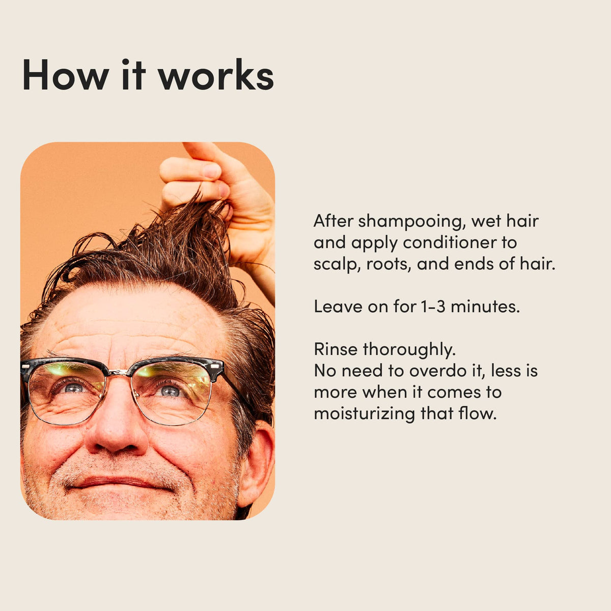 After shampooing, wet hair and apply conditioner to scalp, roots, and ends of hair. Leave on for 13 minutes. Rinse thoroughly. No need to overdo it, less is more when it comes to moisturizing that flow.