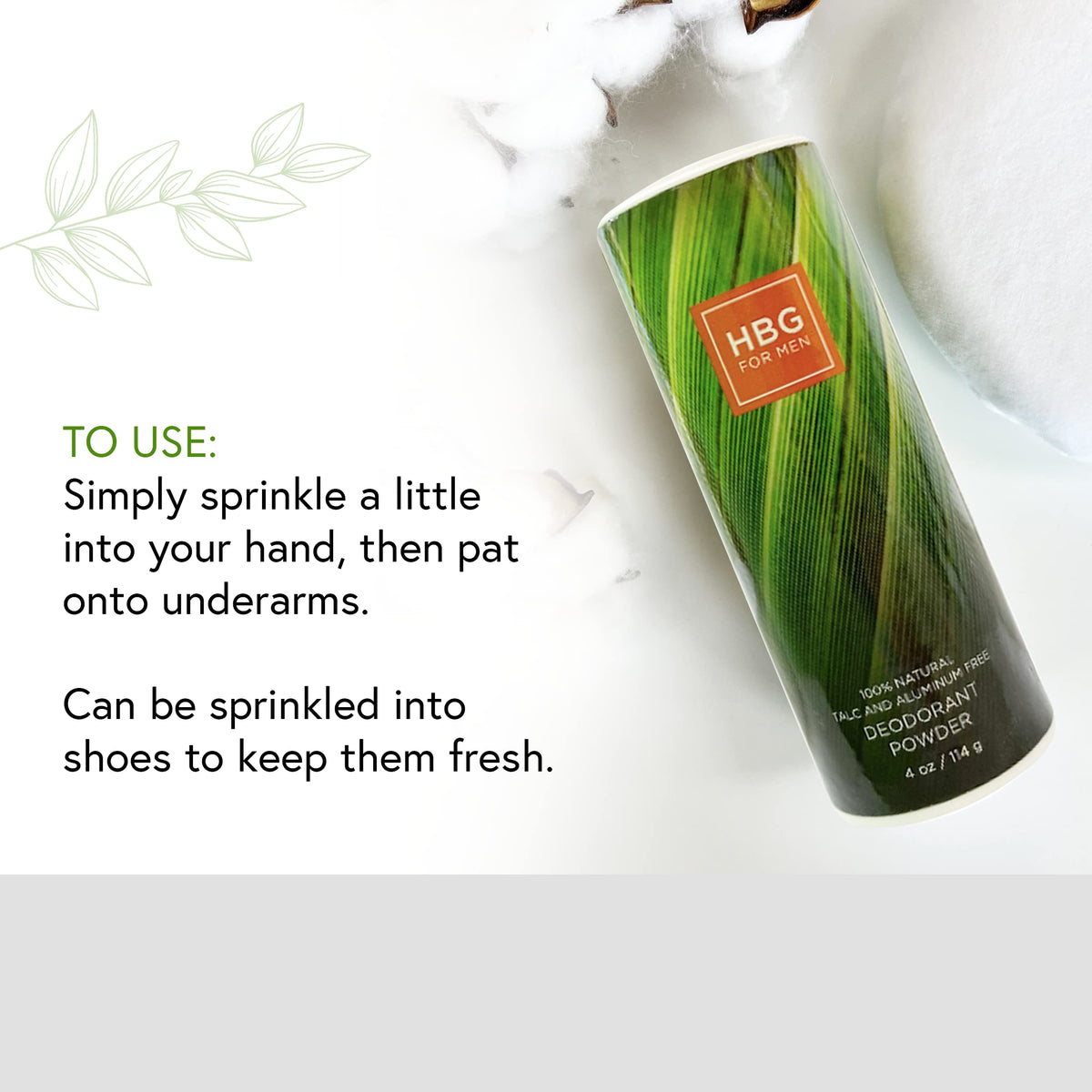 To use as a natural deodorant apply powder to underarms as a shaving powder wet skin and apply powder before shaving as an antichaffing powder apply to areas prone to chafing as a foot powder apply to feet to keep them dry and fresh.