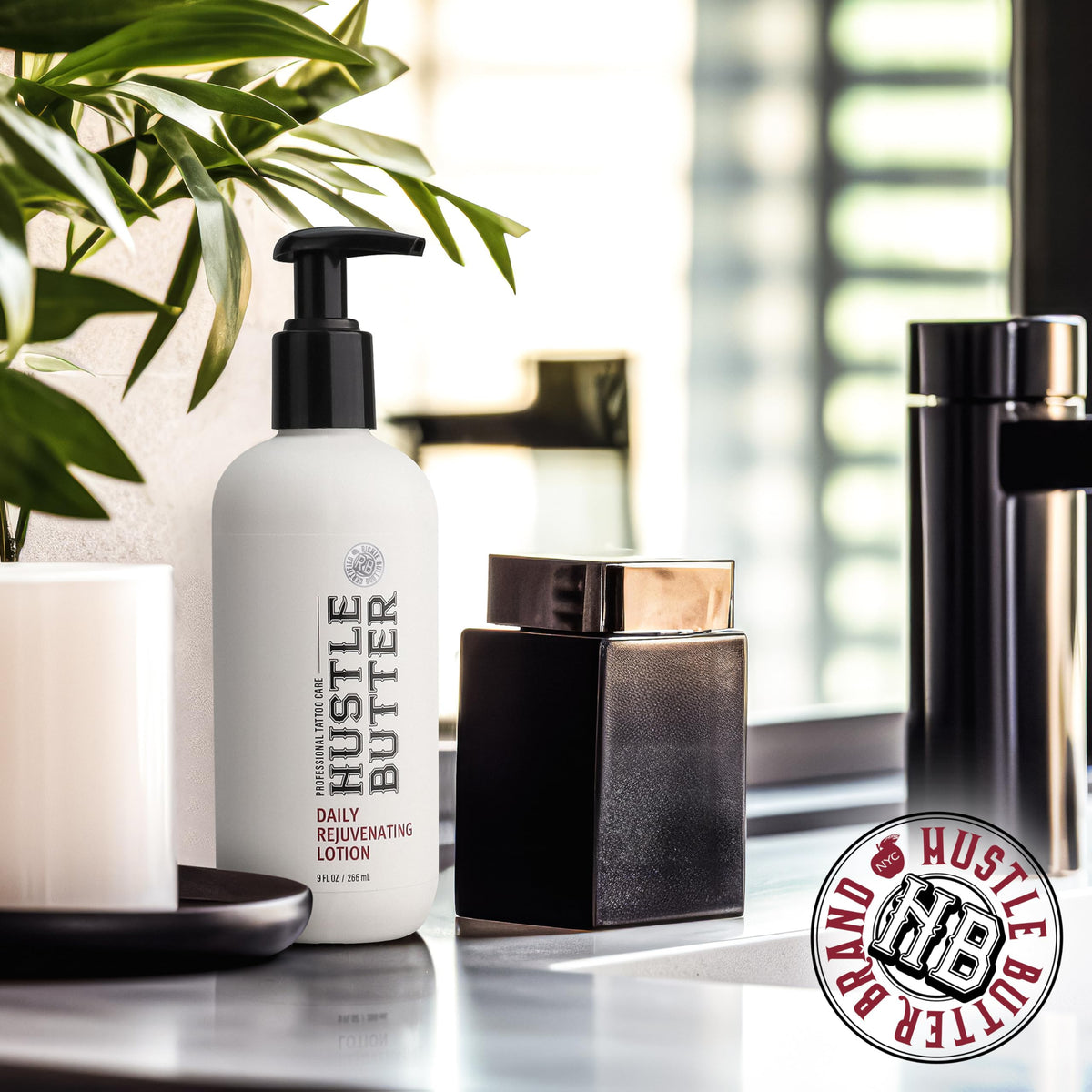 Short Product Description :: Hustle Butter Daily Rejuvenating Lotion is the answer to your dry skin prayers. Made with naturally-derived, vegan, and cruelty-free ingredients, this lotion will not only rejuvenate your artwork but will leave your skin feeling soft and silky-smooth. With ingredients like Shea Butter, Aloe, and Jojoba Seed Oil, our lotion is designed to keep your skin and art looking and feeling its best, for life.