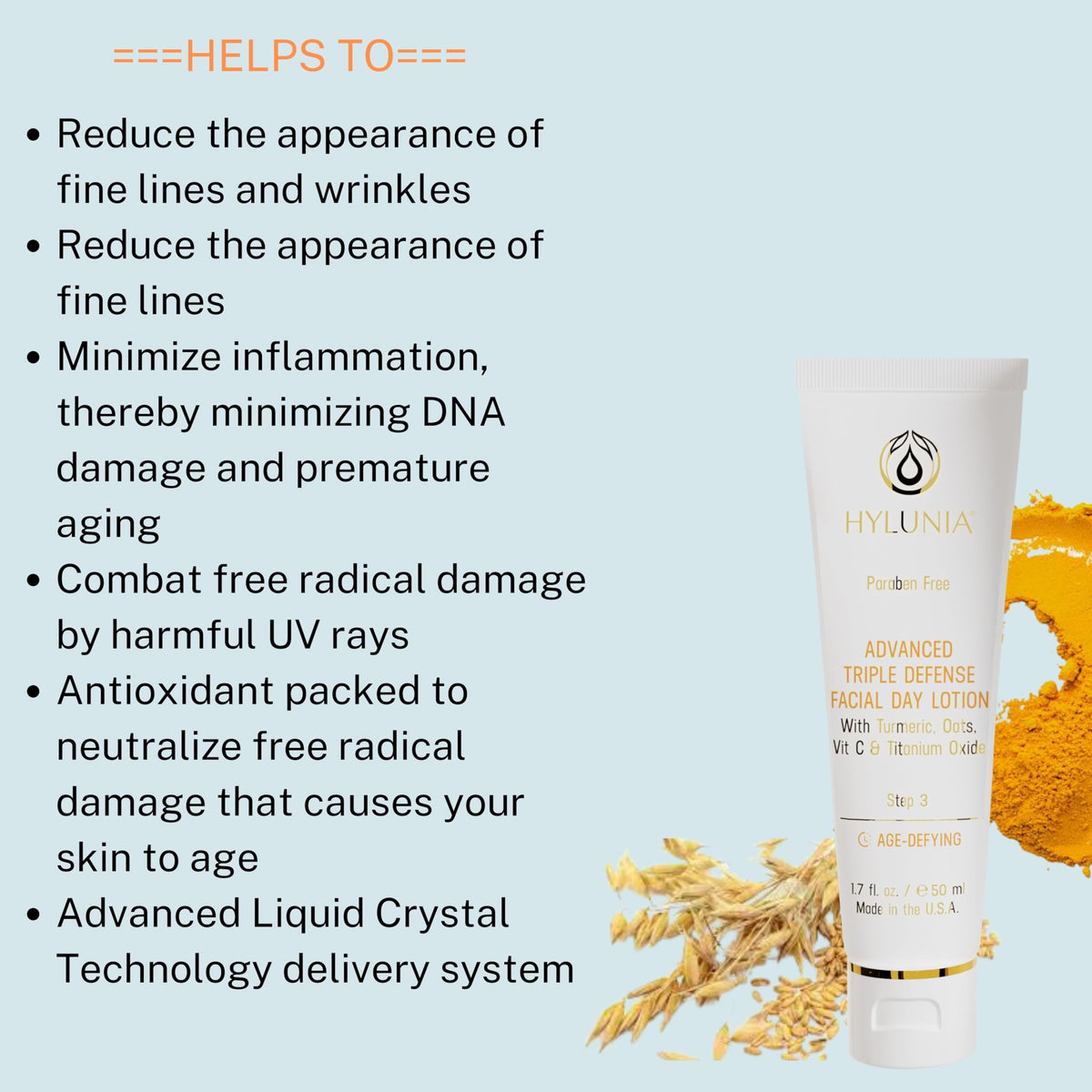 Hydrate, protect, and rebuild collagen with Hylunia Triple Defense Day Lotion. This age-defying moisturizer combines Vitamin C, Turmeric, and Titanium Dioxide to provide clean, non-toxic hydration for all skin types.