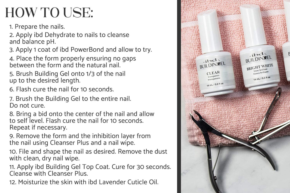 Directions :: 1. Prepare the nails.2. Apply ibd Dehydrate to nails to cleanse and balance pH.3.Apply 1 coat of ibd PowerBond and allow to try.4. Place the form properly ensuring no gaps between the form and the natural nail.5. Brush Building Gel onto 1/3 of the nail up to the desired length.6. Flash cure the nail for 10 seconds.7. Brush the Building Gel to the entire nail. Do not cure.8. Bring a bid onto the center of the nail and allow to self level. Flash cure the nail for 10 seconds. Repeat if necessary.9. Remove the form and the inhibition layer from the nail using Cleanser Plus and a nail wipe.10. File and shape the nail as desired. Remove the dust with clean, dry nail wipe.11. Apply ibd Building Gel Top Coat. Cure for 30 seconds. Cleanse with Cleanser Plus.12. Moisturize the skin with ibd Lavender Cuticle Oil.