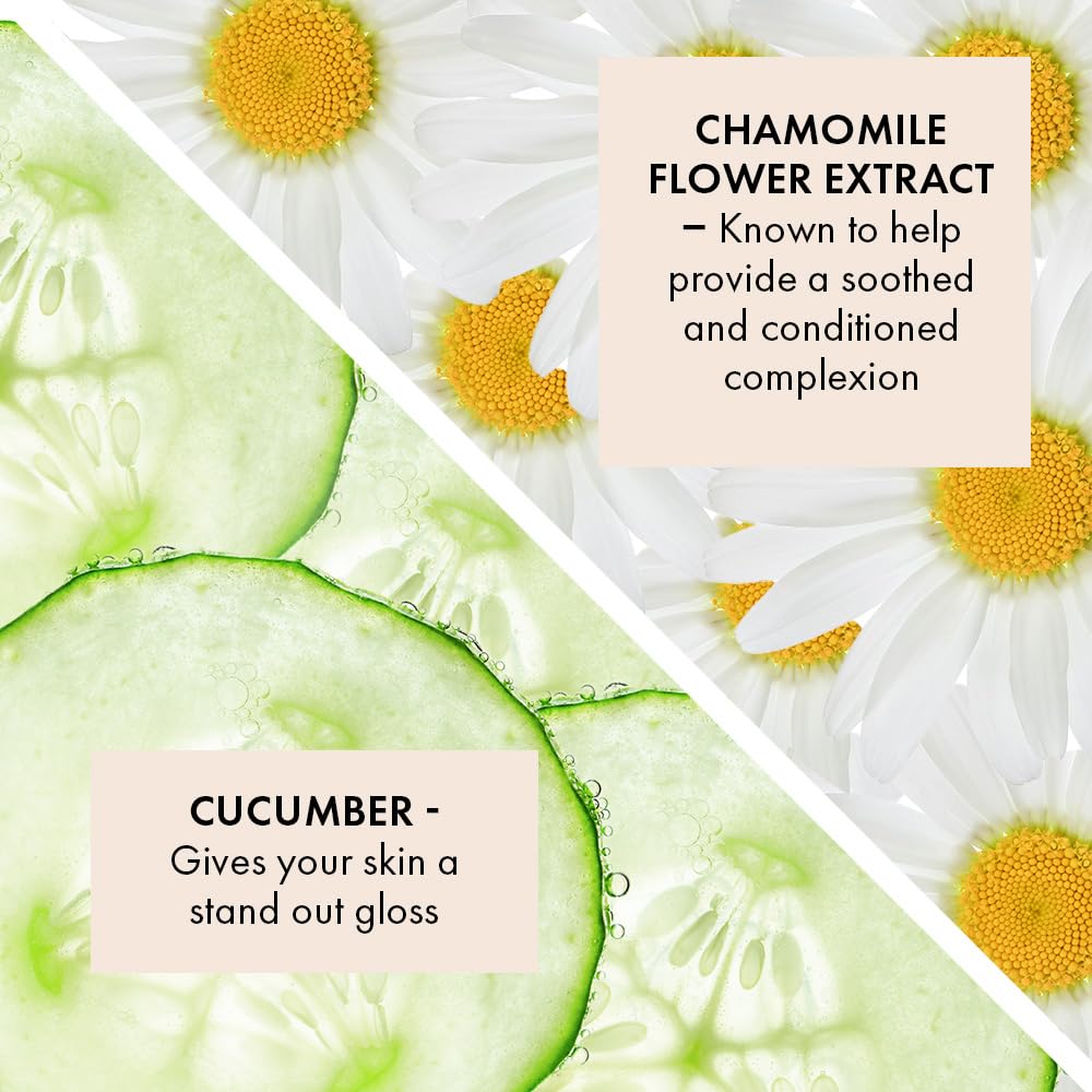 Ingredients: Aqua, Glycerine, Butylene Glycol, PPG26Buteth26, PEG40 Hydrogenated castor oil, Phenoxyethanol, Cucumis Sativus Cucumber Fruit Extract, Propylene Glycol, Chamomilla Recutita Flower Extract, Camellia Sinensis Leaf Extract, Polysorbate 20, PEG20 Glyceryl Laurate, Tocopherol, Linoleic Acid, Retinyl Palmitate, Panthenol, Caffeine, Arginine, Mica, Titanium Dioxide, Iron Oxides CI 77491, Calcium Sodium Borosilicate, Tin Oxide, Parfum, Chlorophenesin, Disodium EDTA, Sodium Benzoate, Potassium Sorbate