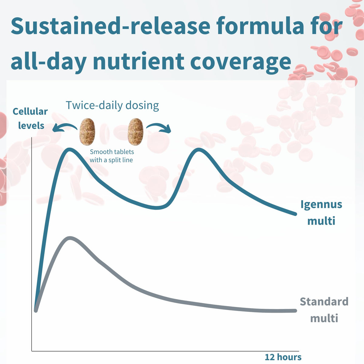 Experience optimal health with Igennus Methylated Women's Multivitamin. This clean label formula with methylated folate and 21 bioavailable nutrients, including iron, offers sustained release benefits for women's well-being.
