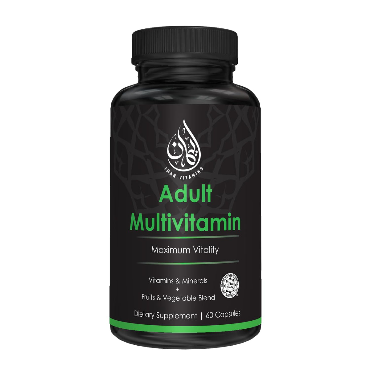 Iman Vitamins Halal Complete Multivitamin Capsules for Adults Men & Women | 42 Fruit & Vegetable Blend with Iron, Zinc, CoQ10, Folic Acid, and Vitamin A, B1, B3, B6, B12, C, D3, E | 60 Count