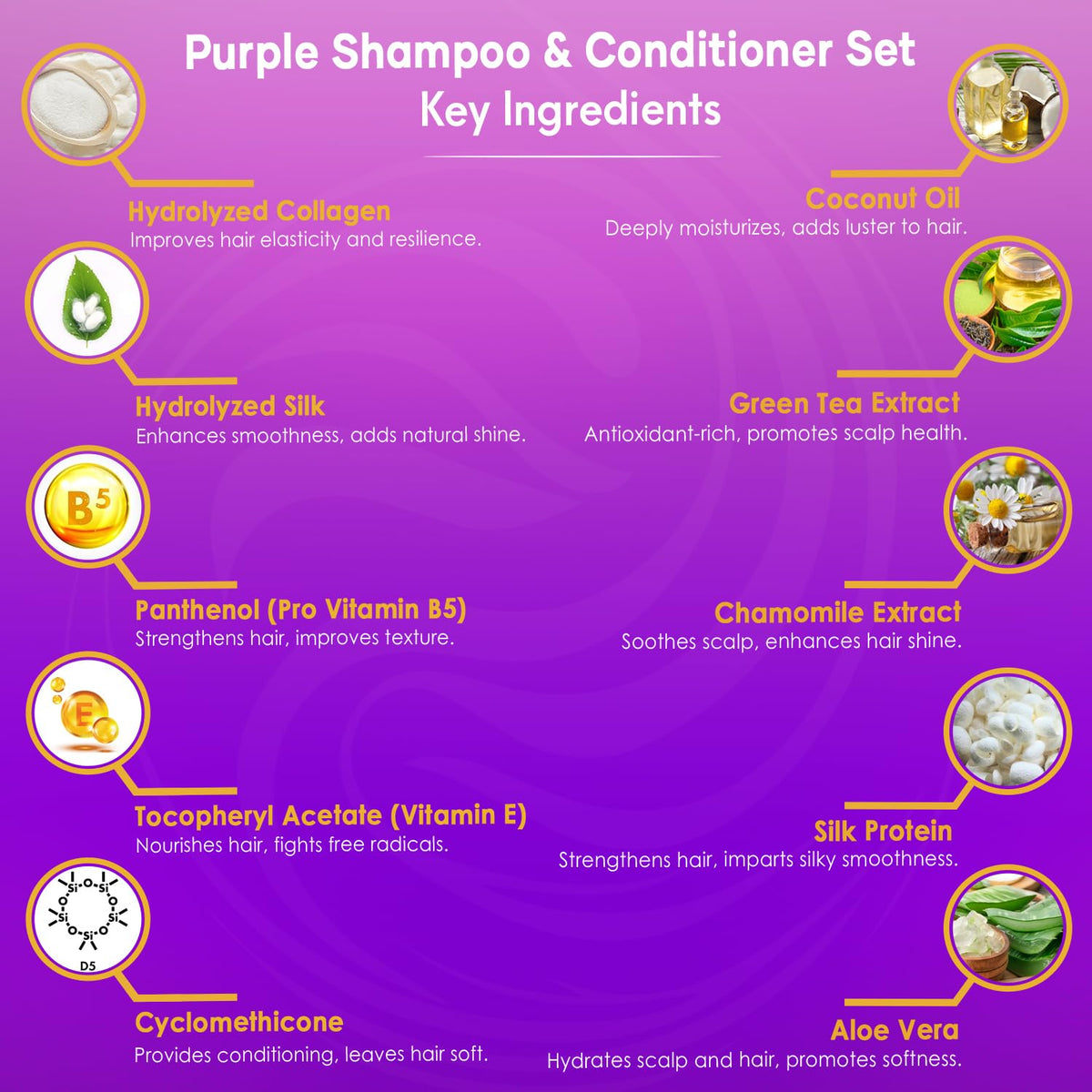 Ingredients: PURPLE SHAMPOO INGREDIENTS Purified Water, Sodium C1416 Alpha Olefin Sulfonate, Cocamidopropyl Betaine, PEG7 Glyceryl Cocoate, Polyquaternium 10, Guar Hydroxypropyltrimonium Chloride, Phenoxyethanol, Caprylyl Glycol, Potassium Sorbate, Ext. D C Violet 2, Camellia Sinensis Green Tea Leaf Extract, Citrus Aurantium Dulcis Orange Extract, Matricaria Chamomilla Chamomile Extract, Silk Protein, Citric Acid, Sodium Chloride, Persea Gratissima Avocado Oil, Panthenol Pro Vitamin B5, Tocopheryl Acetate Vitamin E. PURPLE CONDITIONER INGREDIENTS Purified Water, Stearamidopropyl Dimethylamine, Cyclomethicone, Stearyl Alcohol, Cocos Nucifera Coconut Oil, Behentrimonium Chloride, Polyquaternium 10, Guar Hydroxypropyltrimonium Chloride, Oleth2, Aloe Barbadensis Leaf Juice, Phenoxyethanol, Caprylyl Glycol, Potassium Sorbate, EDTA, Lactic Acid, Camellia Sinensis Green Tea Leaf Extract, Citrus Aurantium Orange Fruit Extract, Ext. D C Violet 2, Panthenol Pro Vitamin B5, Hydrolyzed Collagen, Hydrolyzed Silk, Retinyl Palmitate Vitamin E.