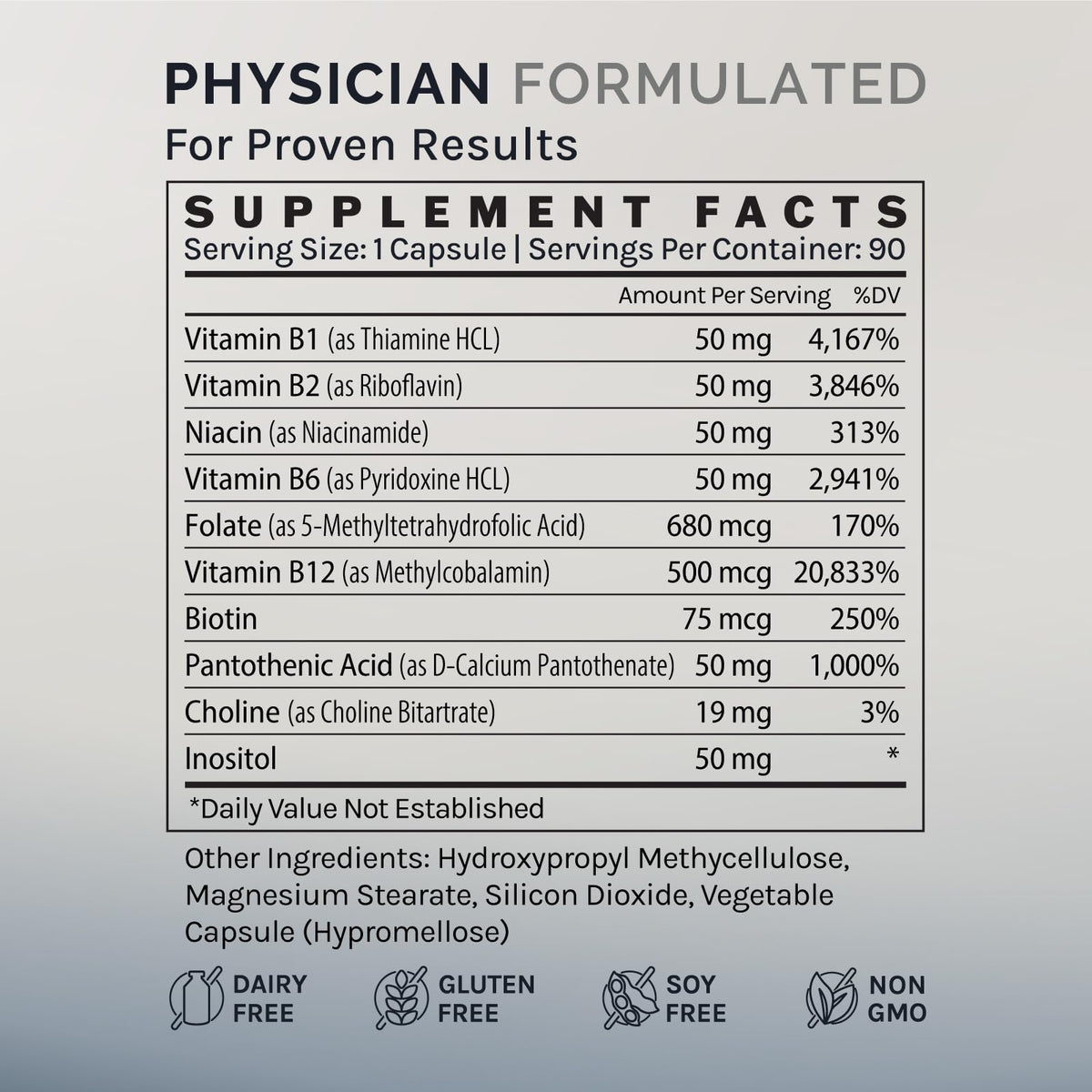 Ingredients: Vitamin B1 as Thiamine HCL 50mg, Vitamin B2 as Riboflavin 50mg, Niacin as Niacinamide 50mg, Vitamin B6 as Pyridozine HCL 50mg, Folate as 5Methyltetrahydrofolic Acid 680mcg, Vitamin B12 as Methylcobalamin 500mcg, Biotin 75mcg, Pantothenic Acid as DCalcium Pantothenate 50mg, Choline as Choline Bitartrate 19mg, Inositol 50mg. Other Ingredients Hydroxypropyl Methylcellulose, Magnesium Stearate, Silicon Dioxide, Vegetable Capsule Hypromellose.