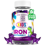 Iron Dinosaur Gummies for Kids with Vitamin C by New Elements. Sugar-free, vegan, and gluten-free for anemia relief, energy, and blood health support in grape flavor.